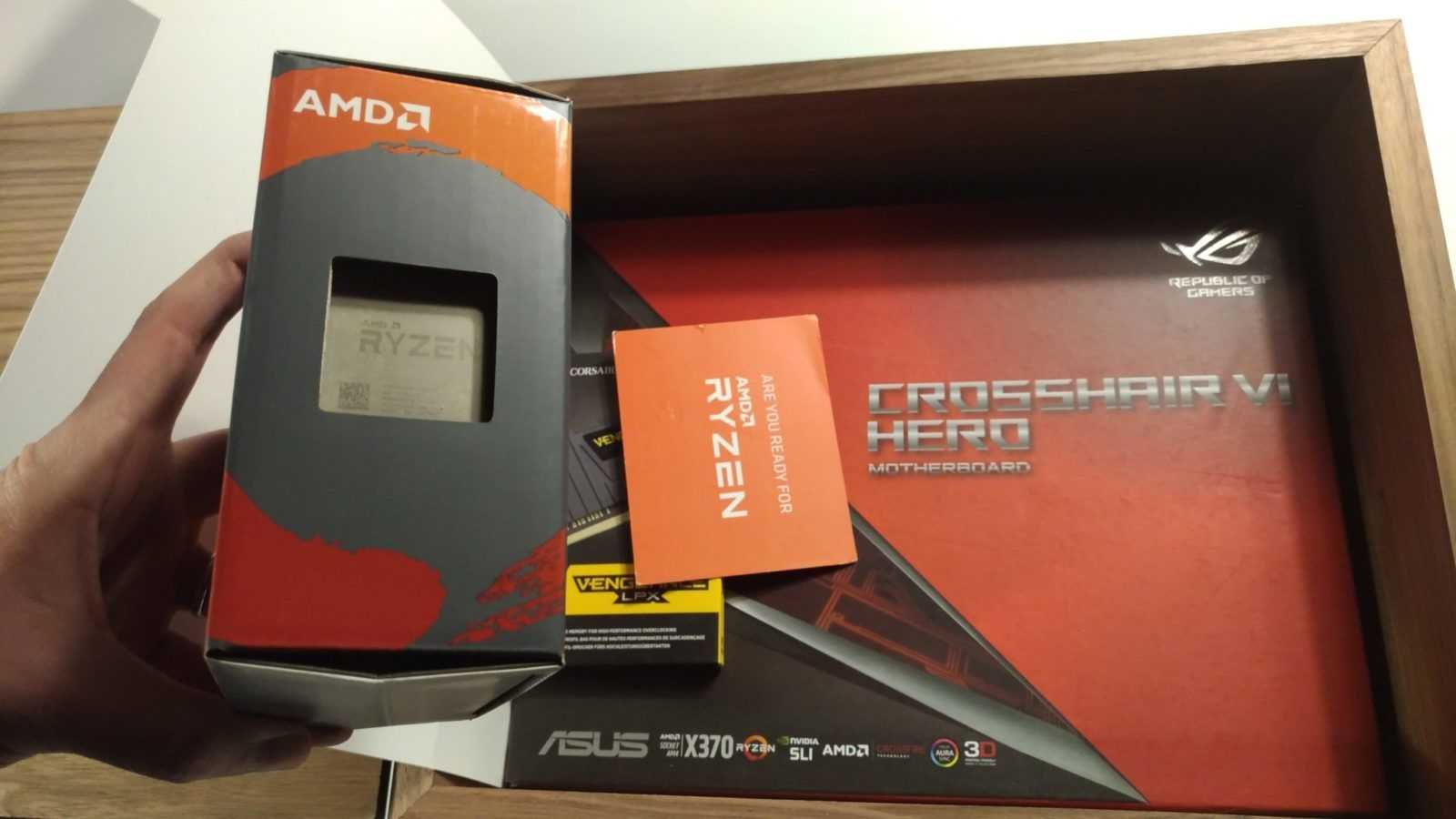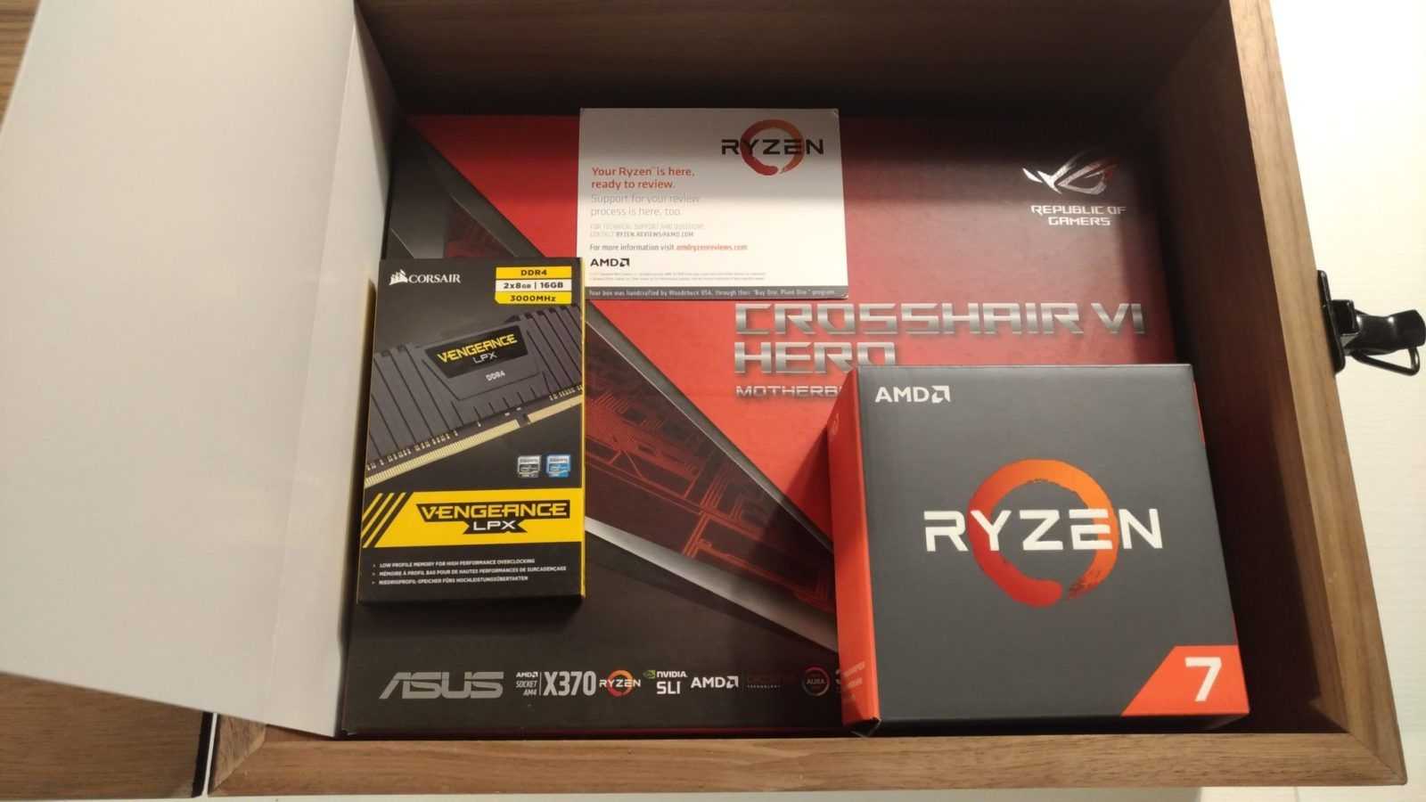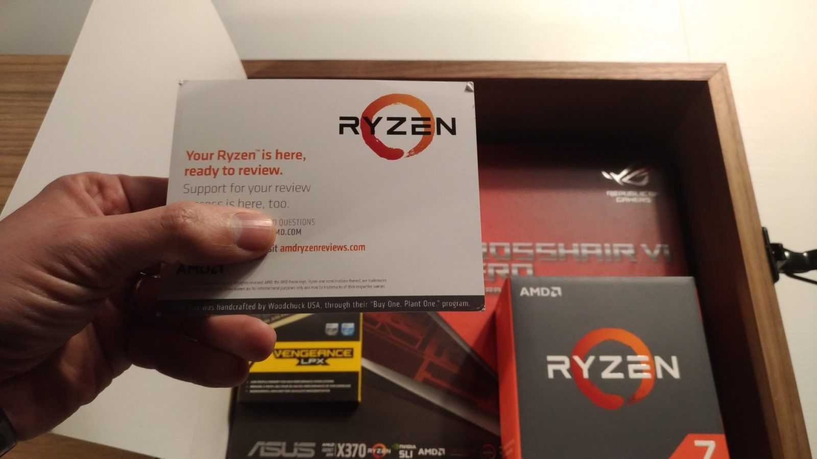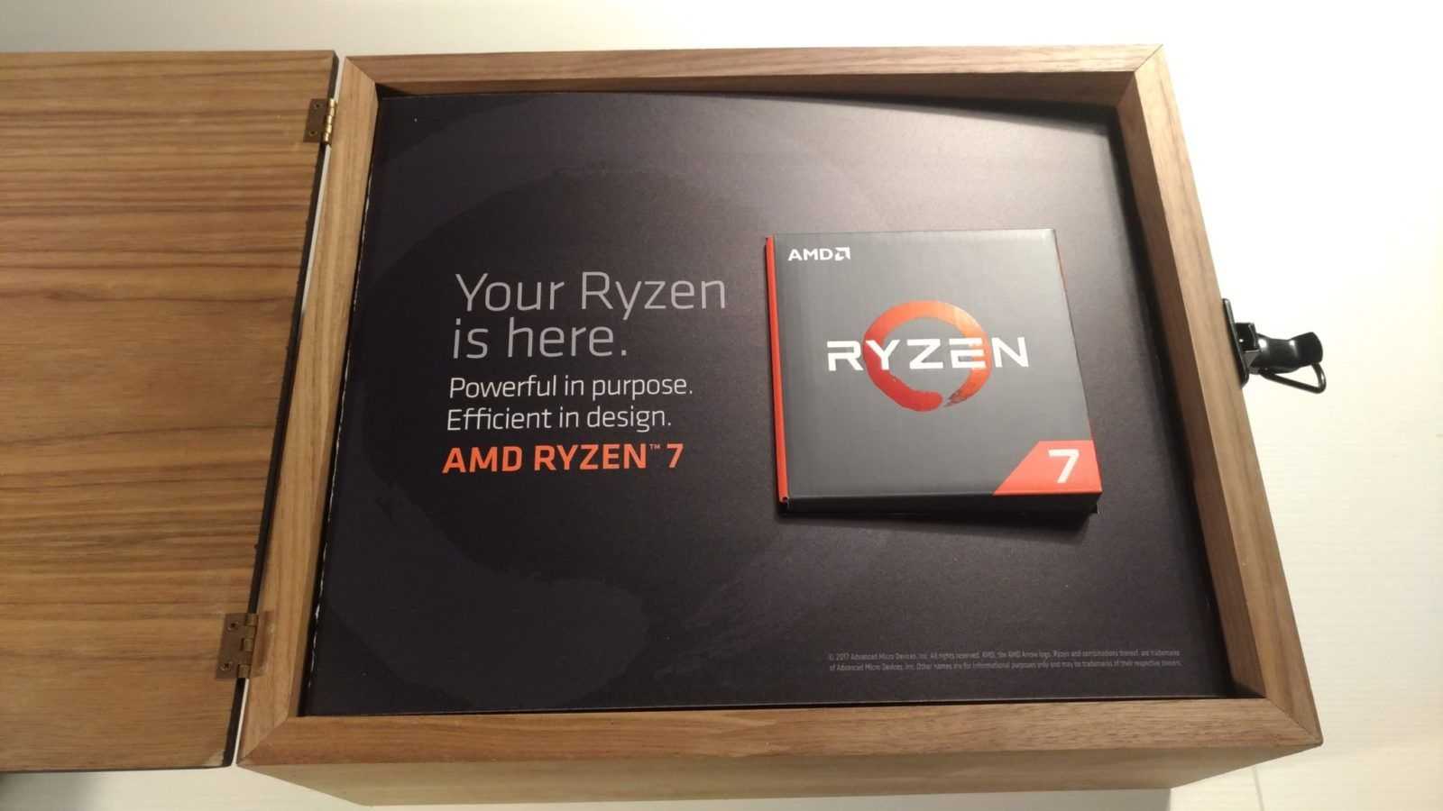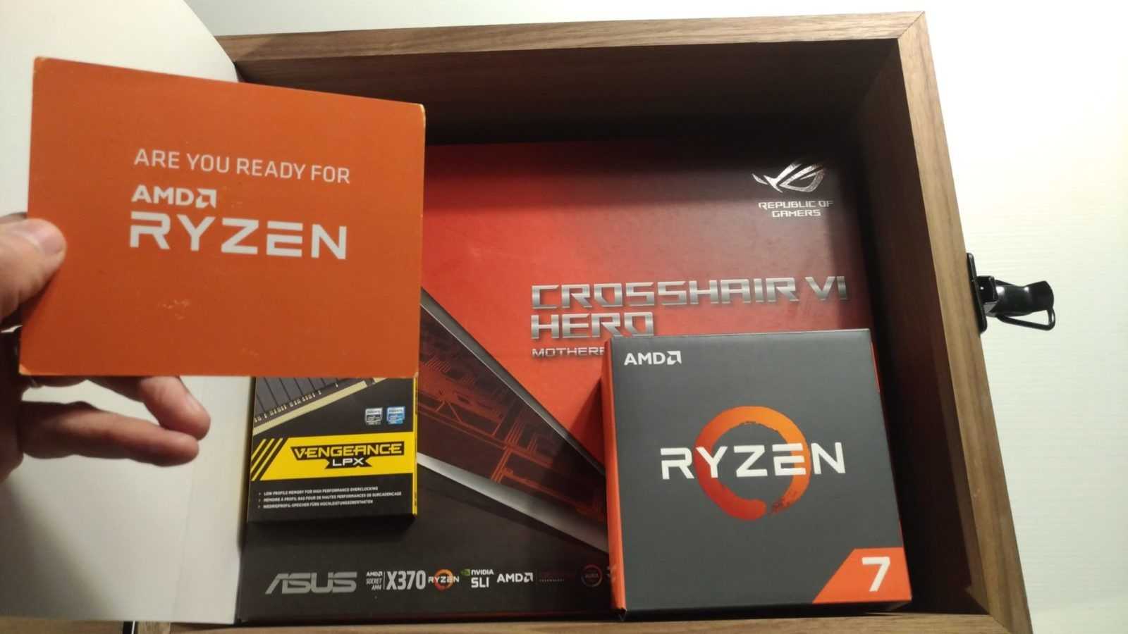 Gametimers abbiamo appena ricevuto l’esclusivo review kit di AMD Ryzen e in questa gallery vi mostriamo con orgoglio il suo contenuto! Il kit ci è arrivato in una spettacolare valigetta di legno, con sopra il logo AMD Ryzen pirografato. All’interno abbiamo trovato il top di gamma della famiglia Ryzen, ossia il modello Ryzen 7 1800X, con clock di 3.6GHz, ma capace di spingersi fino a 4GHz in modalità Boost. Questo processore ha 8 core e 16 thread, con un TDP di appena 95W! Insieme alla CPU, nel suo packaging originale, anche una scheda madre ASUS Crosshair VI Hero, basata sulla nuova piattaforma AM4 e quindi su chipset AMD X370. Per finire un kit di memorie DDR4 di Corsair. Si tratta di due moduli Vengeance LPX DDR4-3000, per un totale di 16GB. Separatamente abbiamo ricevuto anche un dissipatore ad aria Noctua e un dissipatore a liquido a circuito chiuso griffato Ryzen. Nei prossimi giorni riceveremo anche gli altri due modelli della famiglia Ryzen, ossia il 1700X e il 1700. E metteremo alla prova il tutto, pure in video, per raccontarvi le performance di questa nuova e attesissima famiglia di CPU basate su core Zen. Per AMD pare sia arrivato il momento della riscossa!
