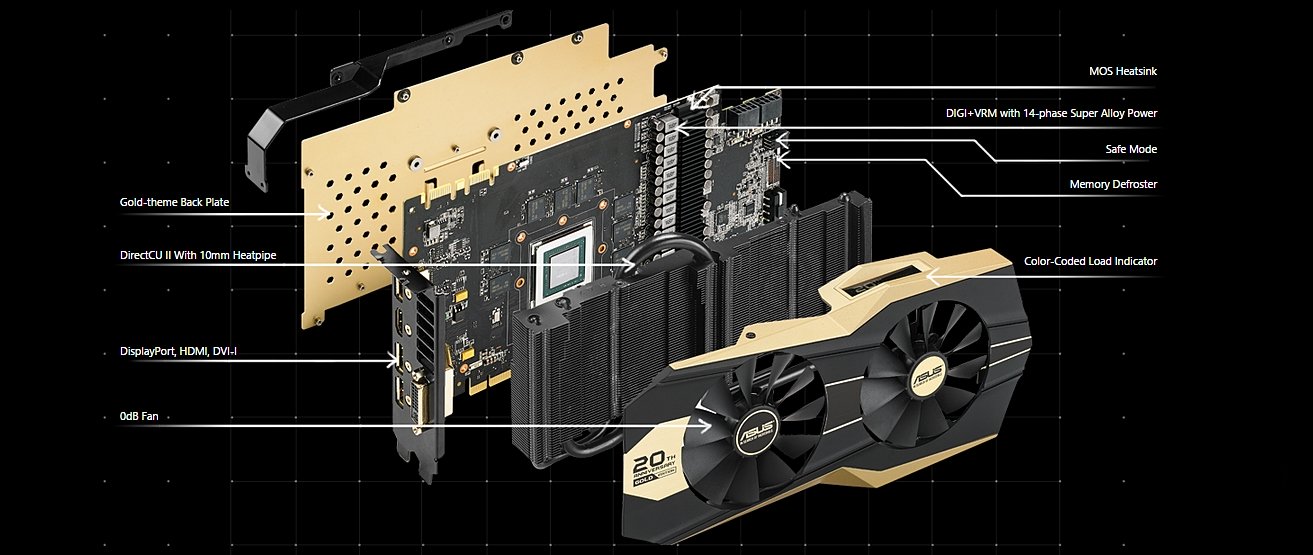 Per l’occasione è stata presentata una scheda video molto particolare, la ASUS GTX 980 20th Anniversary Gold Edition (GOLD20TH-GTX980-P-4GD5), caratterizzata da rifiniture in nero e oro e da prestazioni di tutto rispetto con overclock di serie.