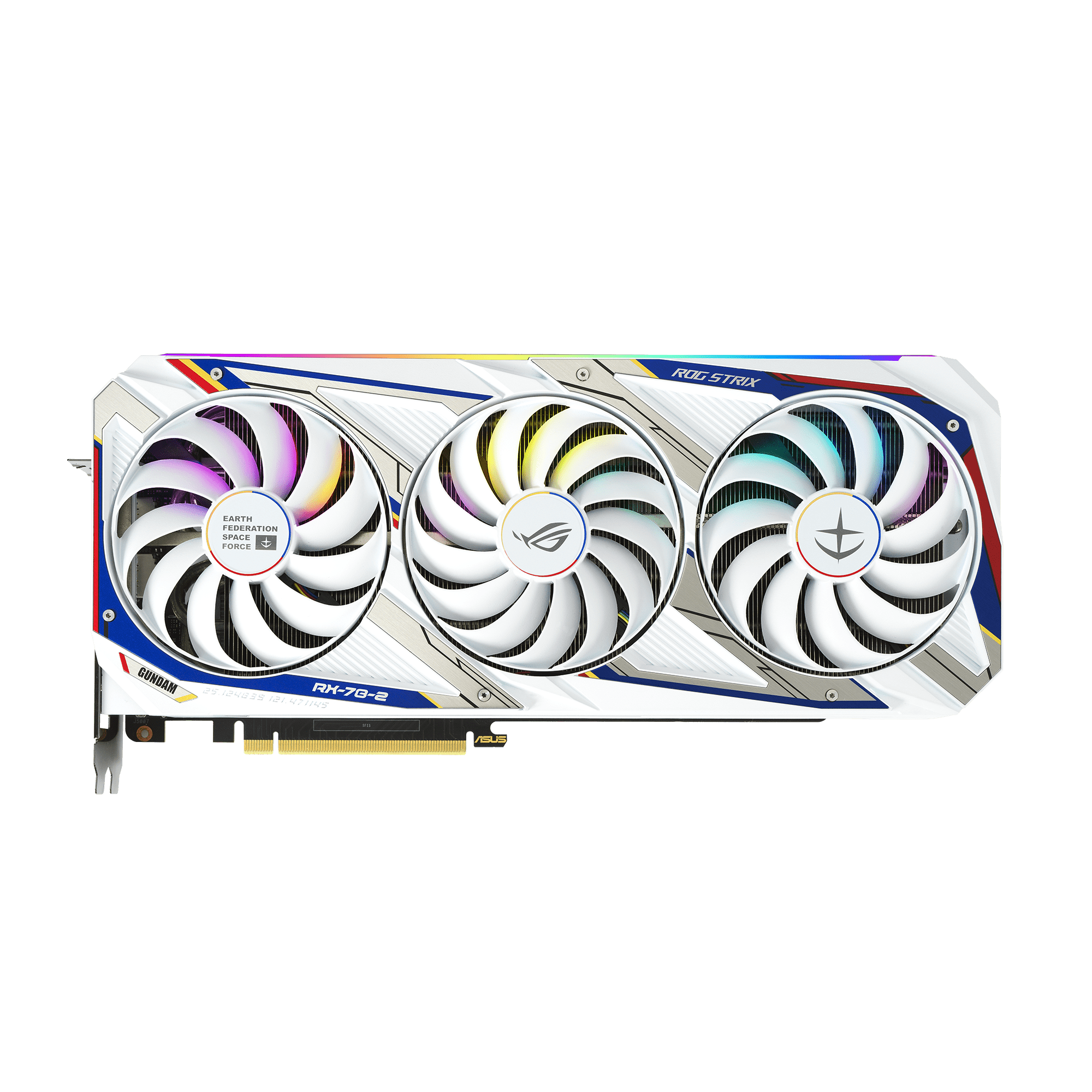 Il vero pezzo forte di questa linea sono le due schede video ASUS ROG Strix RTX 3080 e ASUS ROG Strix RTX 3090. Entrambe hanno un overclock di fabbrica che ne incrementa le frequenze di funzionamento e presentano un design completamente bianco con le tipiche decorazioni dei Gundam e impreziosite dall’illuminazione RGB.