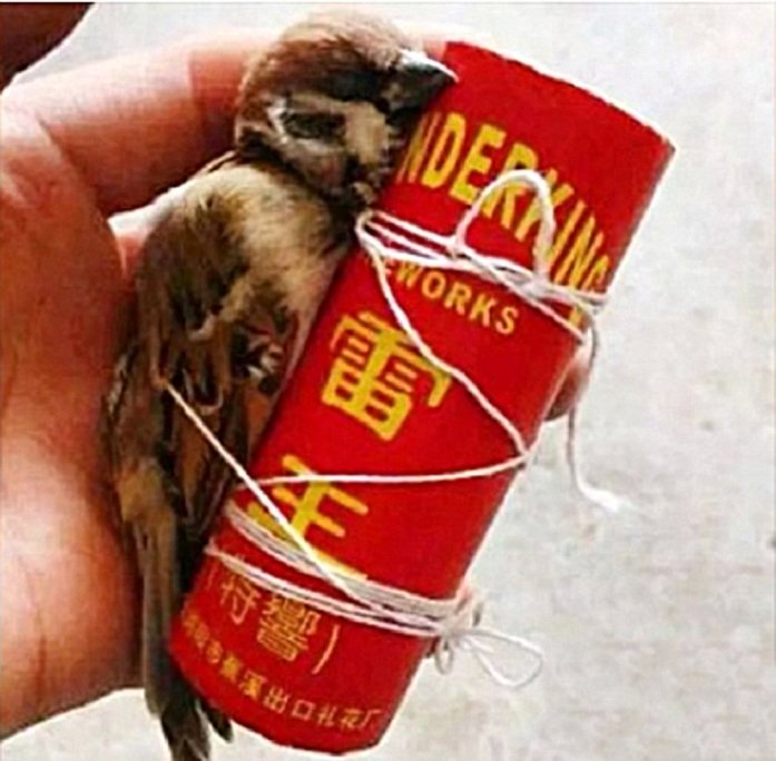 L’immagine che trovate allegata all’articolo è stata scattata da Chu, che è arrivato proprio nel momento giusto: il fuoco di artificio nell’immagine era difettoso e quindi non era esploso, così l’uomo ha potuto liberare il passerotto. L’uccellino era terrorizzato ma illeso, ed è volato via rifugiandosi in un cespuglio! Purtroppo molti suoi simili non hanno avuto la stessa fortuna e la vicenda resta davvero spaventosa, e spaventoso è anche pensare che un videogioco come Angry Birds possa aver ispirato un tale atto.