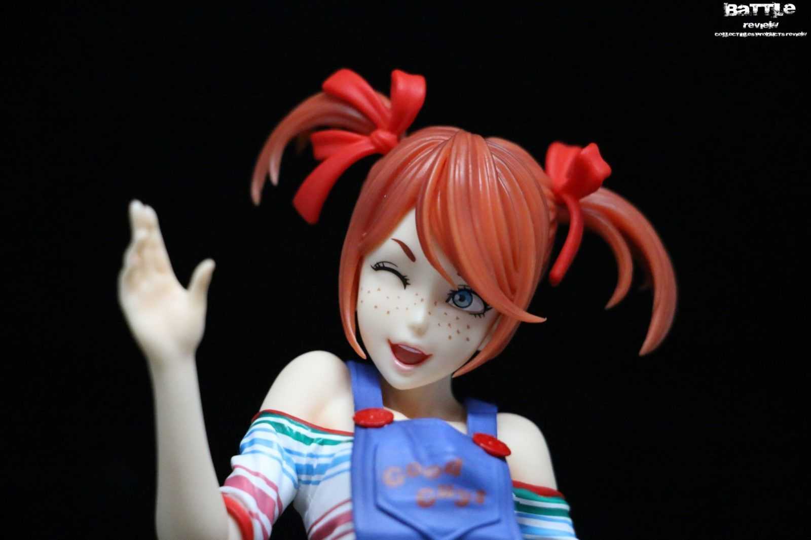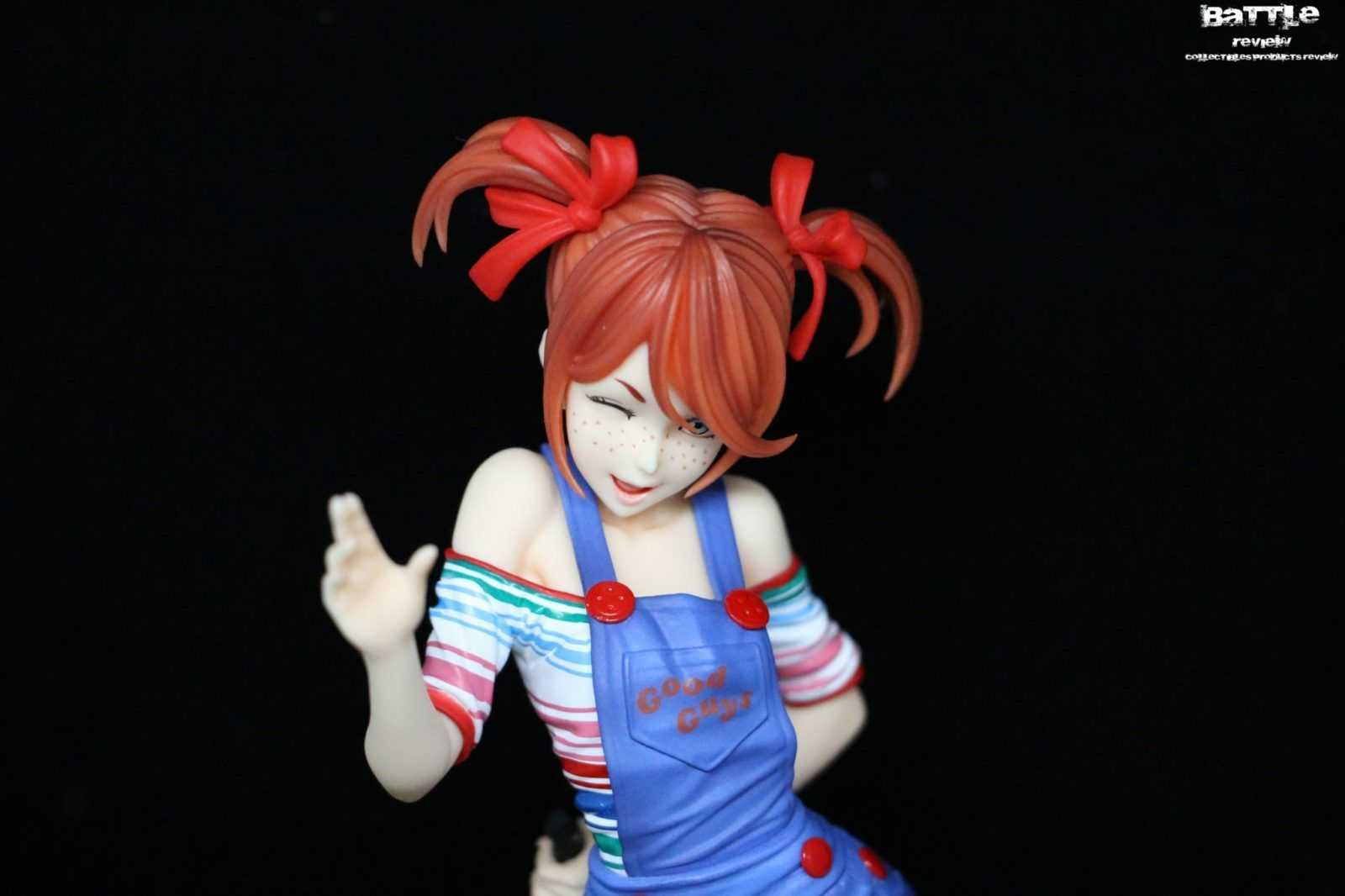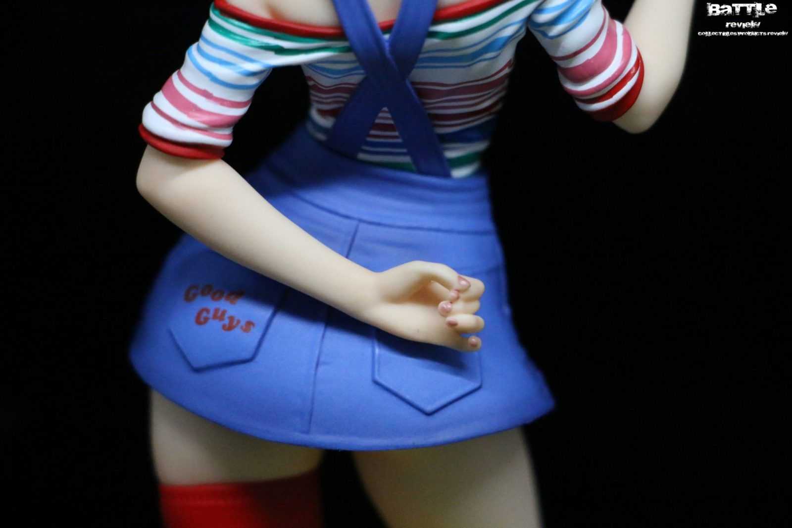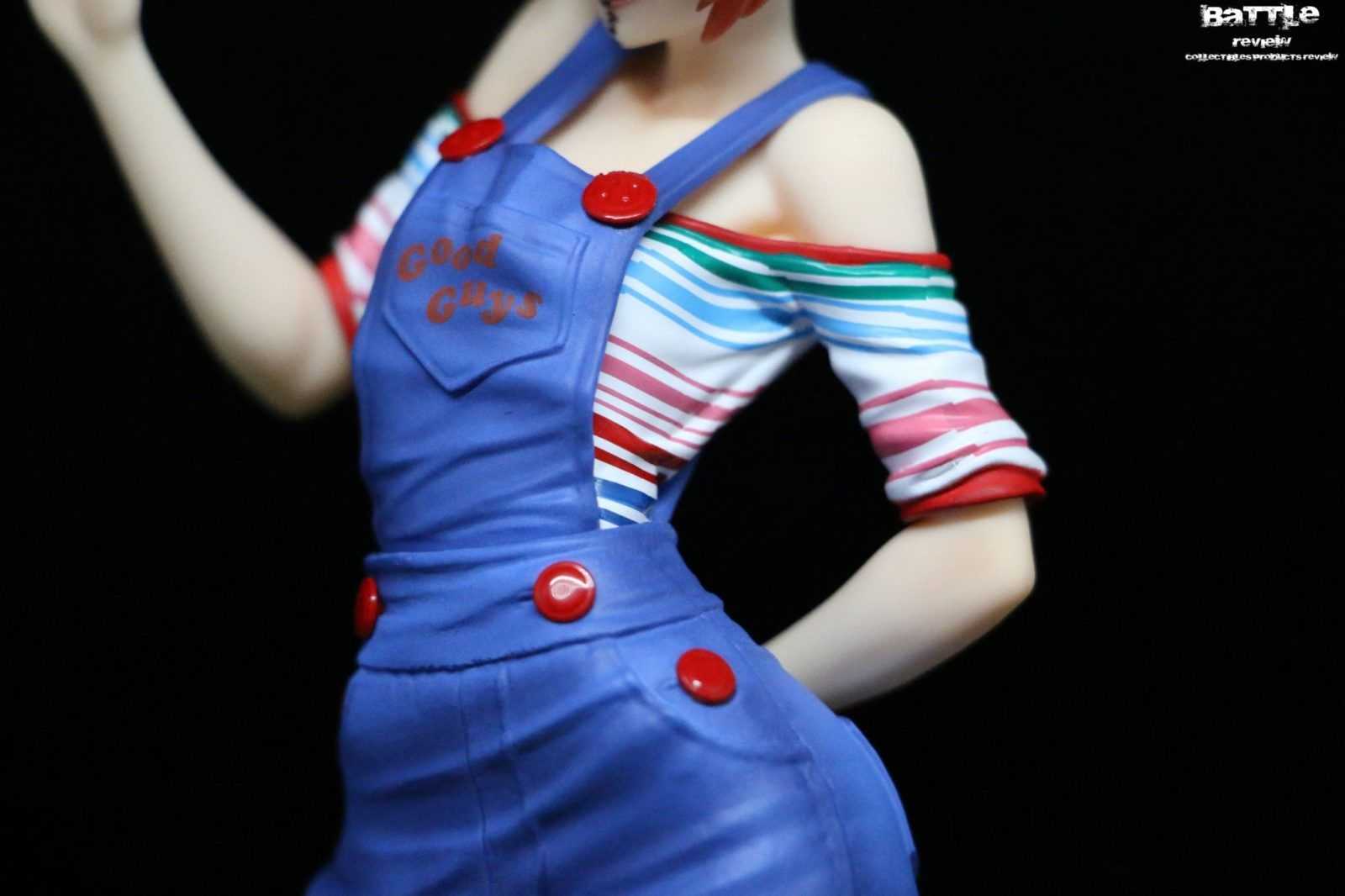 Alta circa 20cm, la figure è scolpita e colorata alla perfezione in una posa molto infantile con la mano destra tesa in alto. Gli abiti sono colorati e scolpiti alla perfezione e nessun dettaglio è stato tralasciato, come ad esempio le calze rosse, una estesa fino alla coscia e l’altra corta o le scritte “Good Guys” sul petto e nella tasca posteriore. La maglietta a strisce colorate è senza nessun tipo di sbavatura e ricrea perfettamente le pieghe del tessuto. I bottoni rossi lucidi risaltano sulla salopette a minigonna dando ancora di più un aspetto innocente.