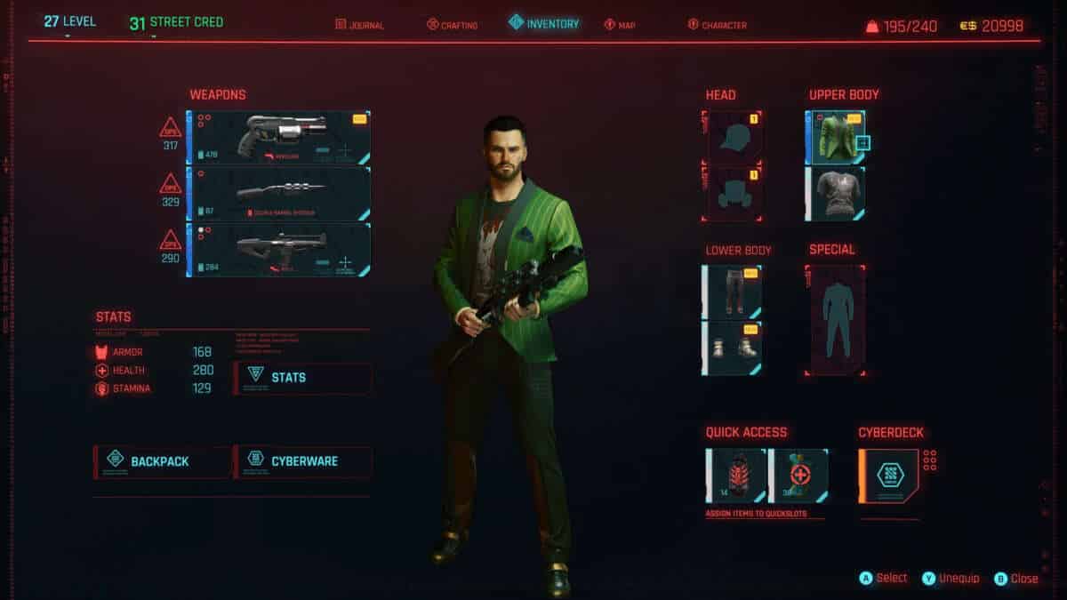 Il sistema di crescita di Cyberpunk 2077 è davvero variegato e profondo. Troviamo delle caratteristiche principali (riflessi, fisico, intelligenza eccetera) che è possibile aumentare al passaggio di livello, e legate alle caratteristiche abbiamo moltissime abilità. Queste possono spaziare dall’utilizzo delle armi (pistole/revolver, fucili/mitra, lame, armi contundenti e quant’altro) alle capacità fisiche (recupero di resistenza/salute), dal crafting all’immancabile hacking, dallo stealth al sangue freddo (un bonus che si attiva dopo aver eliminato un nemico). Queste abilità migliorano con l’utilizzo, fornendo mano a mano dei punti talento da investire in una miriade di perk.