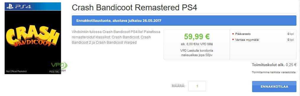 Un sito finlandese ha da poco aperto i preordini per il remake della trilogia originale di Crash Bandicoot. Lo stesso sito, che indicava in origine la data del 28 febbraio come possibile uscita del titolo, ha da poco modificato la relativa pagina.