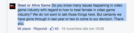Questo il messaggio su Facebook che spiega la questione. “Avete idea di quanti problemi stanno spuntando nell’industria del videogioco in relazione a come viene dipinta la figura della donna? Non abbiamo intenzione di parlare qui di queste cose. Ma ne abbiamo passate tante negli ultimi due anni, prima di arrivare a questa decisione”.