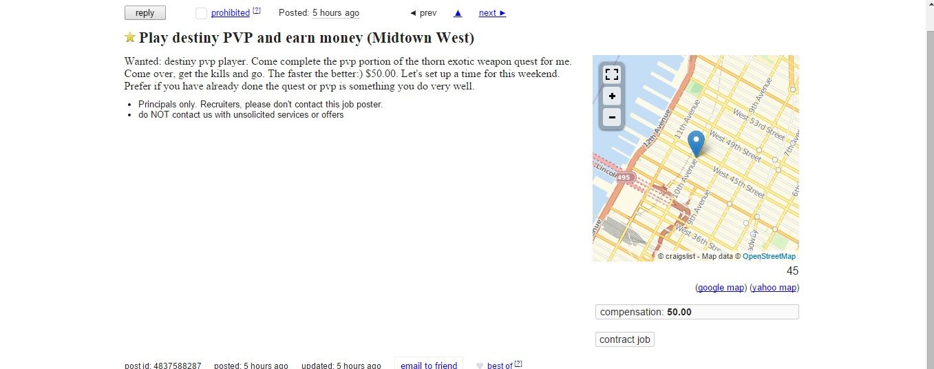 Come sicuramente sapete, uno dei modi per ottenere armi esotiche in Destiny è attraverso le “Taglie esotiche”. Ottenibili riscuotendo taglie comuni da Xander 99-40 nella Torre, quelle esotiche sono costituite da una serie di missioni da completare in sequenza, alcune delle quali devono essere eseguite all’interno del Crogiolo. Come potete immaginare, per un giocatore poco affine con le modalità PvP, riuscire a completare queste taglie può comportare non pochi problemi, specialmente se la sua connessione Internet non gli consente tempi di latenza ridotti. Per aggirare tale ostacolo, utente di Destiny di New York è addirittura ricorso a un annuncio su Craigslist, dove richiede l’aiuto di un giocatore esperto disposto a recarsi a casa sua questo fine settimana per ottenere i 500 punti nel Crogiolo necessari a sbloccare il Cannone Portatile “Aculeo”. Per il disturbo offre ben 50 Dollari, circa 42 Euro. Sareste disposti ad accettare un simile incarico?