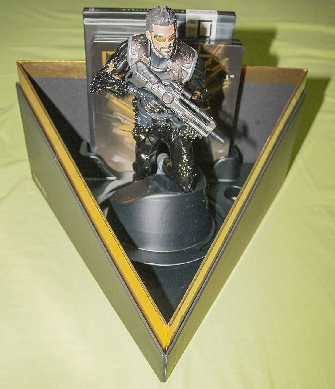 Aprendo il box a forma di prisma si trovano, ben stipati, lo Steelbook, l’Artbook, e la statua di Adam Jensen.