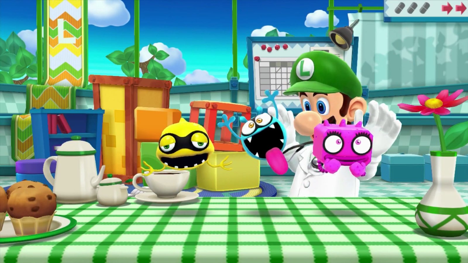 Dr. Luigi, a distanza di ventitré anni, fa esattamente la stessa cosa, con l’aggiunta di qualche piccola variante e una veste grafica completamente rinnovata (e ci mancherebbe il contrario!). Parlando di ciò che lo contraddistingue dai titoli che vedono Mario come medico di turno, Dr. Luigi introduce una variante alla meccanica appena descritta: la cosiddetta “Operazione L”, una modalità in cui le pillole invece di essere formate da due mini sezioni colorate come di consueto, sono costituite da quattro mini sezioni disposte, per l’appunto, a L. Per dirla in altri termini, invece della normale pastiglietta “lunga”, immaginatene due disposte a formare il pezzo a L del Tetris. In realtà è molto più contorto descriverle che usarle nel gioco vero e proprio, perché all’atto pratico non alterano drasticamente il concetto originale o il grado di sfida, anzi, dal momento che queste nuove medicine contengono tre parti dello stesso colore, in un certo senso facilitano l’opera di rimozione. Si tratta, come già detto, più di un piccolo omaggio al festeggiato che di altro.
