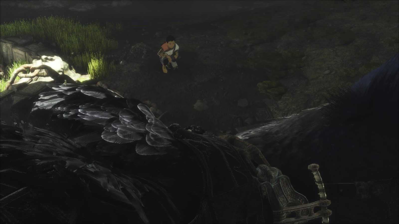 Senza sapere come (né quando) ci risvegliamo a pochi passi da Trico, con il corpo ricoperto di tatuaggi incomprensibili. Siamo all’interno di un’enorme caverna, apparentemente senza via d’uscita, dove la nostra attenzione è attirata solo da Trico e dalla catena che lo lega a terra. Una voce adulta fuori campo ci spiega i pochi dettagli di cui siamo a conoscenza e lascia intendere che si tratti proprio del protagonista che sta raccontando l’inizio della sua storia con la simpatica e strana bestia “mangia-uomini”, come viene chiamata. Trico sembra ostile in un primo momento ma se ne capisce presto il motivo: due lance conficcate su una zampa e sulla spalla gli provocano un gran dolore impedendogli di alzarsi.