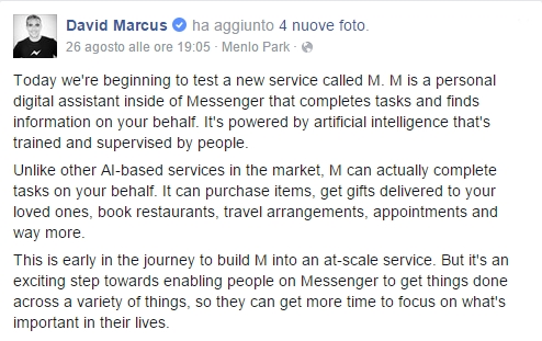 Il suo nome è M (in precedenza si pensava Money Penny) ed è un assistente personale digitale pensato per aiutare gli utenti a trovare informazioni ed eseguire un grande numero di azioni (come prenotare ristoranti o viaggi, gestire appuntamenti etc); M avrà una caratteristica particolare: sarà sì guidato dall’intelligenza artificiale, ma controllato dagli esseri umani.