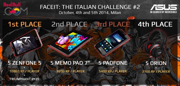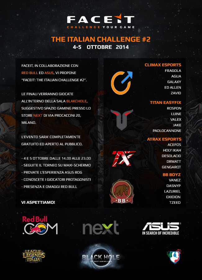 Ritorna la seconda edizione annuale del torneo di League of Legends “FACEIT: The Italian Challenge”, organizzato da FACEIT in collaborazione con ASUS Republic of Gamers, Red Bull e con il supporto ufficiale di LoLItalia e GEC. Un appuntamento davvero imperdibile per tutti gli appassionati di LoL e del gaming competitivo: all’evento saranno infatti presenti diversi YouTubers e alcuni tra i migliori videogiocatori competitivi della scena italiana. La finale si disputa su due giorni, la prima parte si è svolta ieri, mentre la fase finale si svolgerà oggi 5 ottobre 2014 e sarà giocata live dalla sala BlackHole, presso il negozio di PC NEXT HS in via Procaccini 20 a Milano.