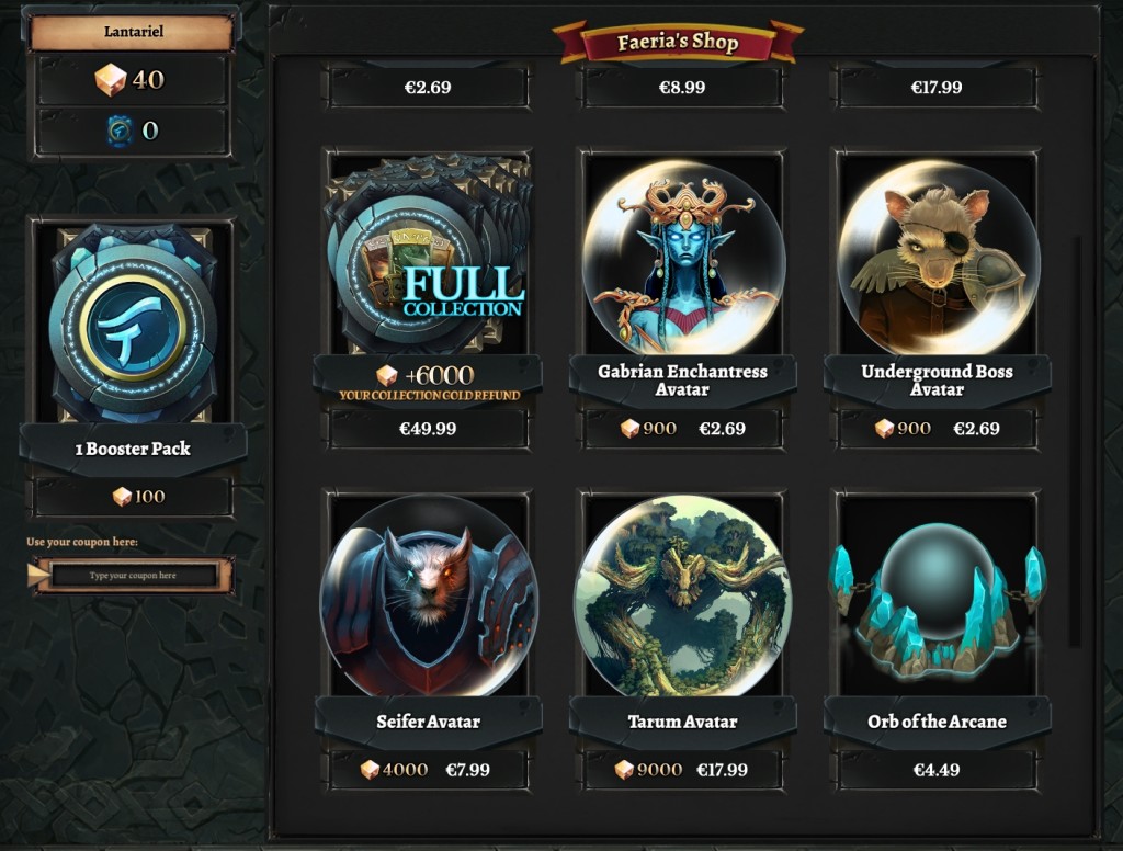 Faeria dispone di una collezione di 262 carte; ogni pacchetto che otterremo affrontando le missioni Single Player o che acquisteremo dallo Shop utilizzando l’oro guadagnato dalle quest giornaliere (solitamente 60 gold per quest completata) o affrontando altri avversari in modalità battaglia (10 gold per partita vinta) contiene cinque carte aggiuntive. Sempre attraverso lo shop potremo utilizzare soldi reali per acquistare altri pacchetti (circa 65 centesimi cadauno) oppure, in alternativa, comprare direttamente l’intera collezione di carte al costo di 49,99 euro, per quanto trovo personalmente che questa scelta vada a rovinare parzialmente la bellezza di questo titolo, togliendo a conti fatti uno scopo al giocatore, ovvero quello di ottenere tutte le carte disponibili.