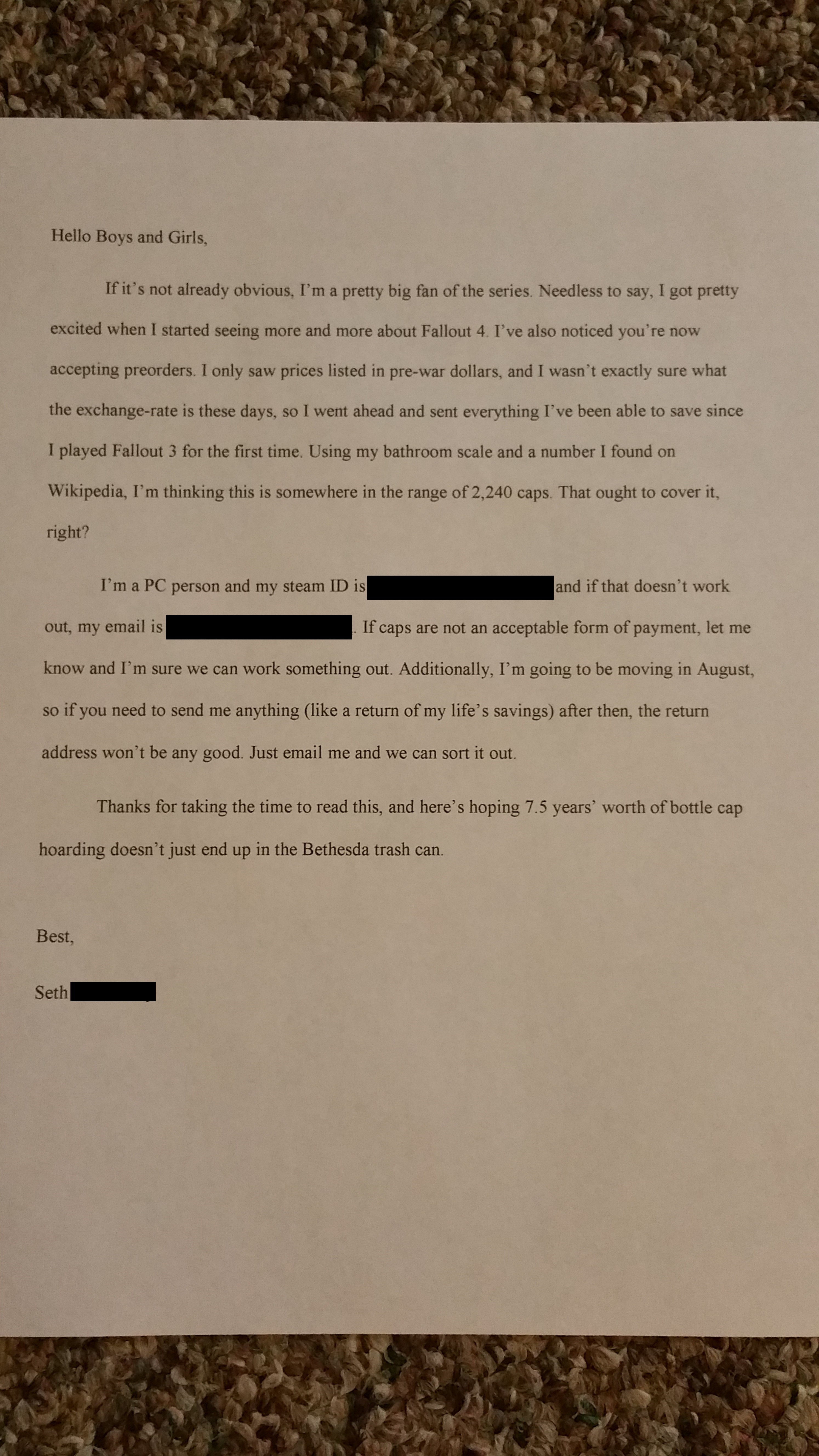 Ci teniamo a sottolineare che non siamo ironici: quando diciamo “genio” intendiamo proprio una persona dall’intelletto fuori dal comune, in senso positivo e non di uno psicopatico, anche se non escludiamo che qualche esimio psicologo possa includere il suo gesto fra i problemi dello spettro autistico. Come altro si può definire un fan tanto sfegatato della serie Fallout che per anni ha collezionato tappi da mandare al produttore del gioco come pagamento del preorder? Quattro anni e mezzo di bevute (non sappiamo esattamente se di Corona Extra, Bud o bibite analcoliche… certamente non di Sunset Salsaparilla… quella buona è la Sioux City, come sanno i dudeist), circa 70 Kg di materiale e – di conseguenza – un costo di spedizione probabilmente superiore al prezzo della Collector’s Edition del gioco… Seth “qualcosa” (il nome è correttamente stato oscurato) è diventato immediatamente il nostro nuovo idolo. E vogliamo sperare che Bethesda apprezzi quanto noi e si ricordi di mandargli una copia del gioco autografata in cambio del suo amore per la serie. Un amore che merita di essere ricambiato. Soprattutto considerato che chi scrive non è stato tanto lungimirante da collezionare i tappi della birra stappata giocando a Fallout 3 e New Vegas: altro che 70 Kg.