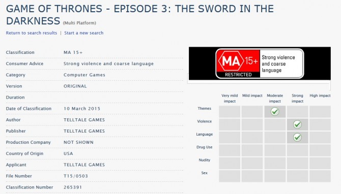 Telltale Games è riuscita a differire la sua serie videoludica di Game of Thrones rispetto alla serie HBO, cercando di creare un titolo destinato a una fetta di pubblico più grande. Nei primi due episodi del gioco lo sviluppatore ha raggiunto il proprio obbiettivo e a quanto pare, anche nell’Episodio 3 non vedremo quelle scene di nudo tanto care alla serie TV. Purtroppo non possiamo dire lo stesso di altre caratteristiche che accomuneranno gioco e serie: secondo l’ente di classificazione australiano, Game of Thrones Episode 3: The Sword in the Darkness presenterà tematiche forti, scene di violenza e linguaggio non proprio nobile. Il terzo episodio dovrebbe essere disponibile verso la fine di marzo. Attendiamo ulteriori conferme.