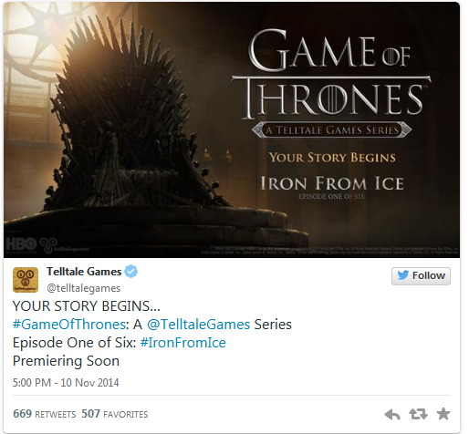 Attraverso la prima immagine pubblicata, Telltale Games ci conferma che la stagione d’esordio di Game of Thrones sarà composta da sei episodi e il titolo del primo episodio sarà “Iron from Ice”, sintonizzatevi dunque su twitter digitando l’hastag #IronFromIce”; l’azienda l’userà per rivelare nuove informazioni.