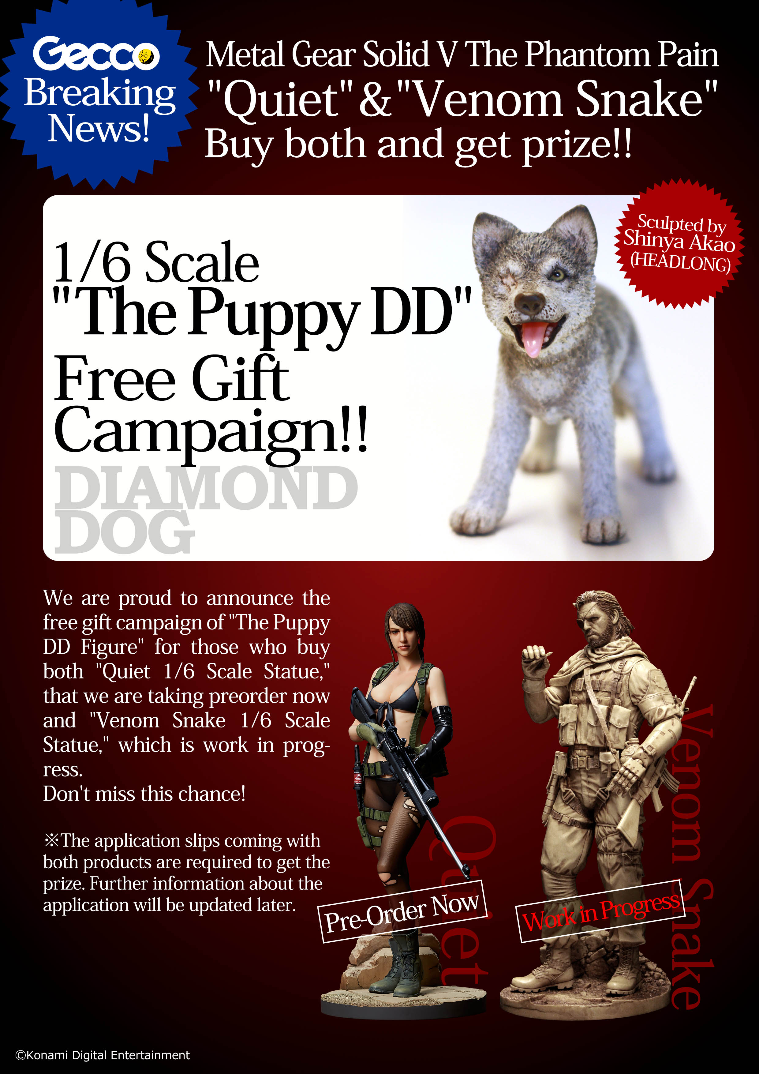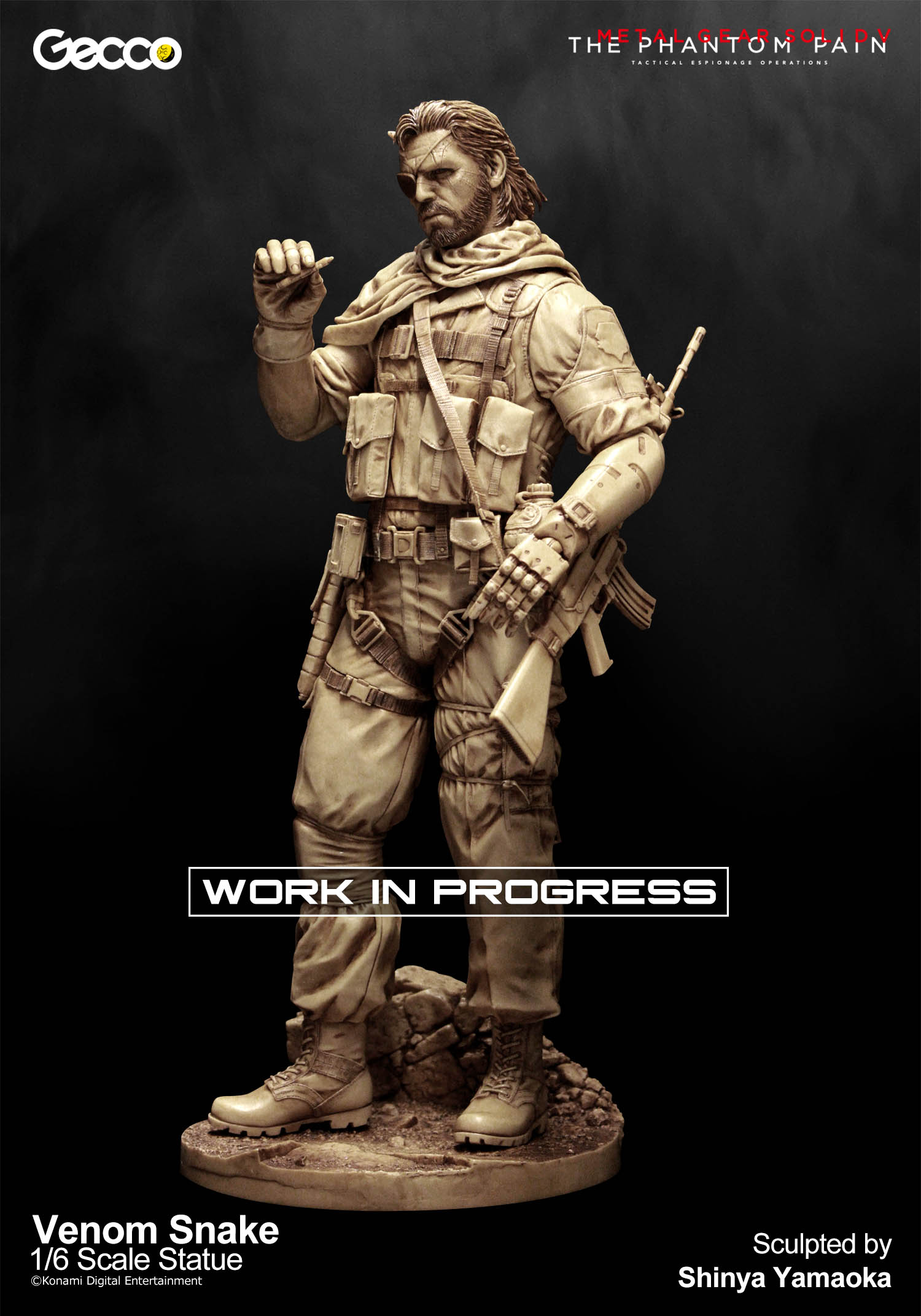 La Gecco continua a sorprendere i fan di Metal Gear Solid V: The Phantom Pain pubblicando una prima immagine della sua statua in scala 1:6 dedicata a Venom Snake. L’azienda nipponica ha approfittato dell’annuncio per svelare una promozione legata sia a questa statua che a quella di Quiet (che prossimamente recensiremo per voi). Coloro che pre-ordineranno entrambe le figure riceveranno in omaggio una statuetta di D-Dog in versione cucciolo, sempre in scala 1:6. Troverete i dettagli su come riceverlo nel sito ufficiale della Gecco.