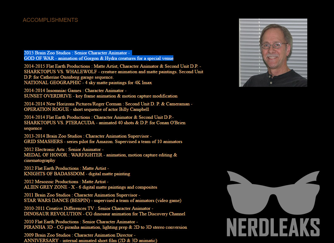 Tra i lavori portati a termine del ben navigato grafico compare la scritta “animazione per Gorgone e Idra per un evento speciale“, chiaramente sotto la dicitura “God of War”. Tale creazione sembra inoltre riportare la data del 2015, davvero troppo recente per essere legata anche alla più recente delle avventure del collerico Kratos, cosa che ha quindi fatto subito drizzare le orecchie ai fan, in fremente attesa di un nuovo capitolo di God of War.