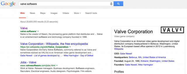 È però interessante notare come valve.software sia riuscito a ottenere la prima posizione nella ricerca di Google. Trovate un’immagine qui sotto.