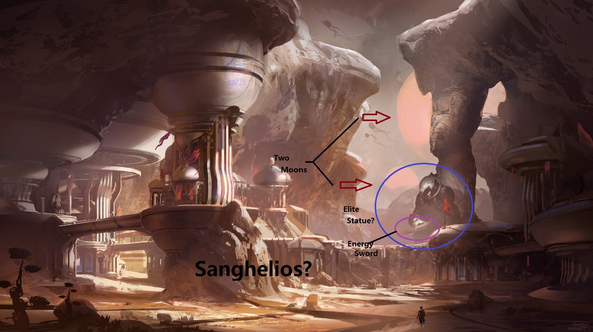 Contemporaneamente su Reddit alcuni utenti hanno segnalato quelle che per loro sono le prove che l’art mostrato riguardi il pianeta Sanghelios. Studiando l’immagine pubblicata qui sotto si possono notare infatti due lune, quella che sembra essere la statua di un Elite e un oggetto simile a una lama energetica. Voi cosa avete scoperto?