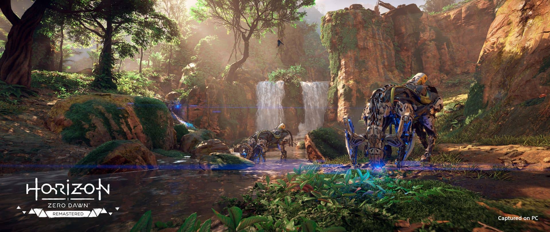 L’idea era quella di avvicinare il gioco alla visione originale di Guerrilla, come raccontato dagli stessi sviluppatori, e far sì che i nuovi giocatori possano vivere Horizon 1 e 2 senza sentire chissà quale distacco tecnologico. Gli ambienti sono più caldi, la vegetazione molto più complessa e presente, gli shader dell’acqua (vero punto debole di Horizon) finalmente convincenti e tante altre piccole chicche che aiutano a immergere ancor di più nel fantastico mondo del gioco PlayStation. Ora è presente non solo la deformazione della neve, ma anche quella degli arbusti e dell’erba quando calpestata. Lo skybox, soprattutto quello notturno, lascia a bocca aperta e persino i modelli di oggetti e città sono stati potenziati. Se negli accampamenti più piccoli è magari difficile da notare, la metropoli di Meridiana è un ottimo esempio delle differenze tecniche. Gli edifici hanno architetture più complesse, bancarelle e negozi hanno molti più oggetti esposti e le strade riescono a contenere il doppio delle persone rispetto a prima. Sempre ricordando che ogni piccolo angolo e anfratto è ora infinitamente più dettagliato, con texture rinnovate per l’occasione e fogliame vario ad arricchirne la vitalità.