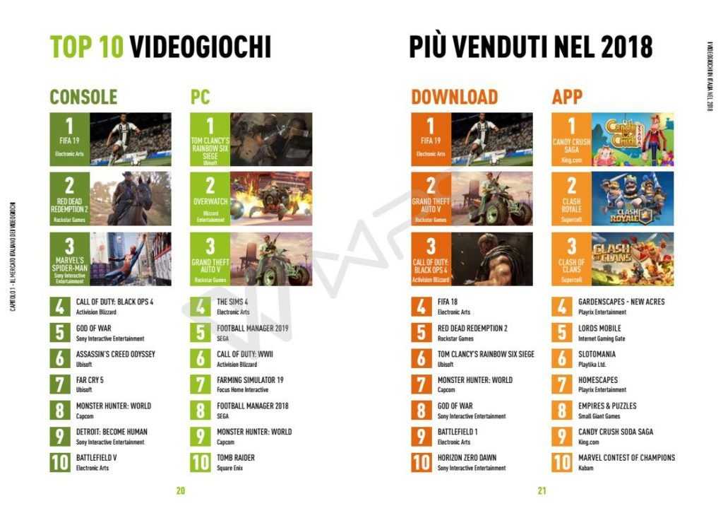 I giochi più venduti in formato digitale, considerando tutte le piattaforme sono stati Fifa19, GTA V e Call of Duty Black Ops 4. Infine la top3 delle app mobile vede in testa Candy Crush Saga, seguita dai due baluardi di Supercell: Clash Royale e Clash of Clans.