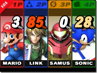 Super Smash Bros. è un titolo molto atteso tanto per Wii U quanto per 3DS. Nuove notizie della versione per la portatile Nintendo ci vengono a informare che questa offrirà una feature piuttosto interessante: praticamente, nel display inferiore della console verrà visualizzata una schermata che riporta il danno subito in percentuale, come potete vedere in questa immagine.