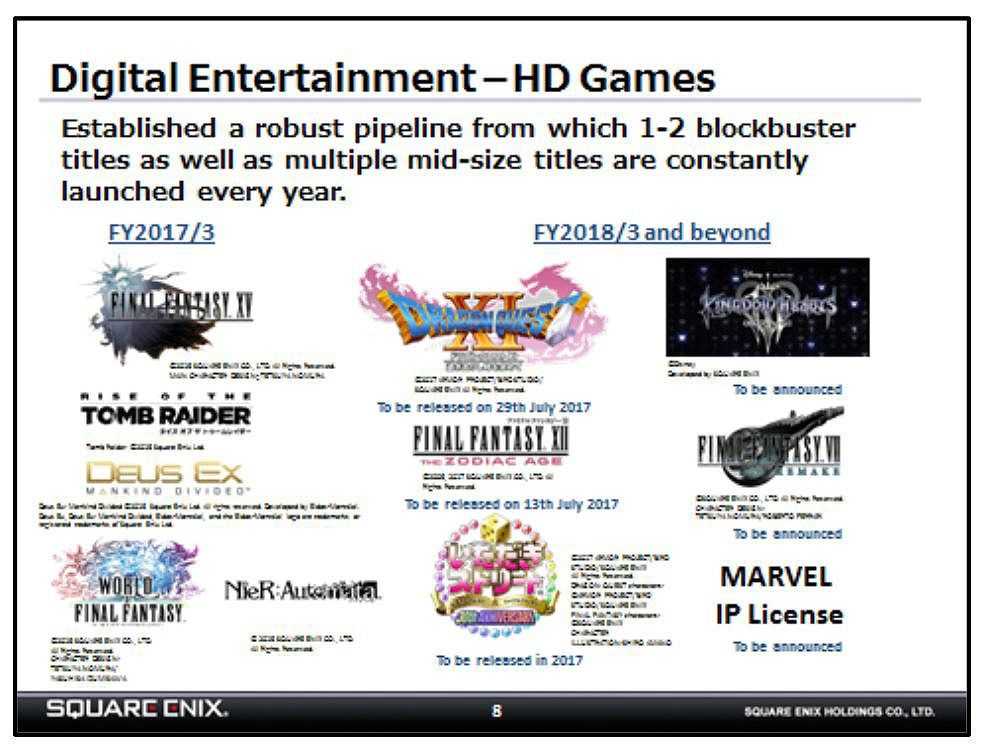 Il CEO Matsuda ha dichiarato: “Questa slide mostra la nostra lineup per il FY2017/3 (anno fiscale 2017 con termine il 31 marzo 2017, NdR) e quella per il FY2018/3 e oltre. Abbiamo in programma di lanciare tutti questi titoli nei prossimi tre anni più o meno“.