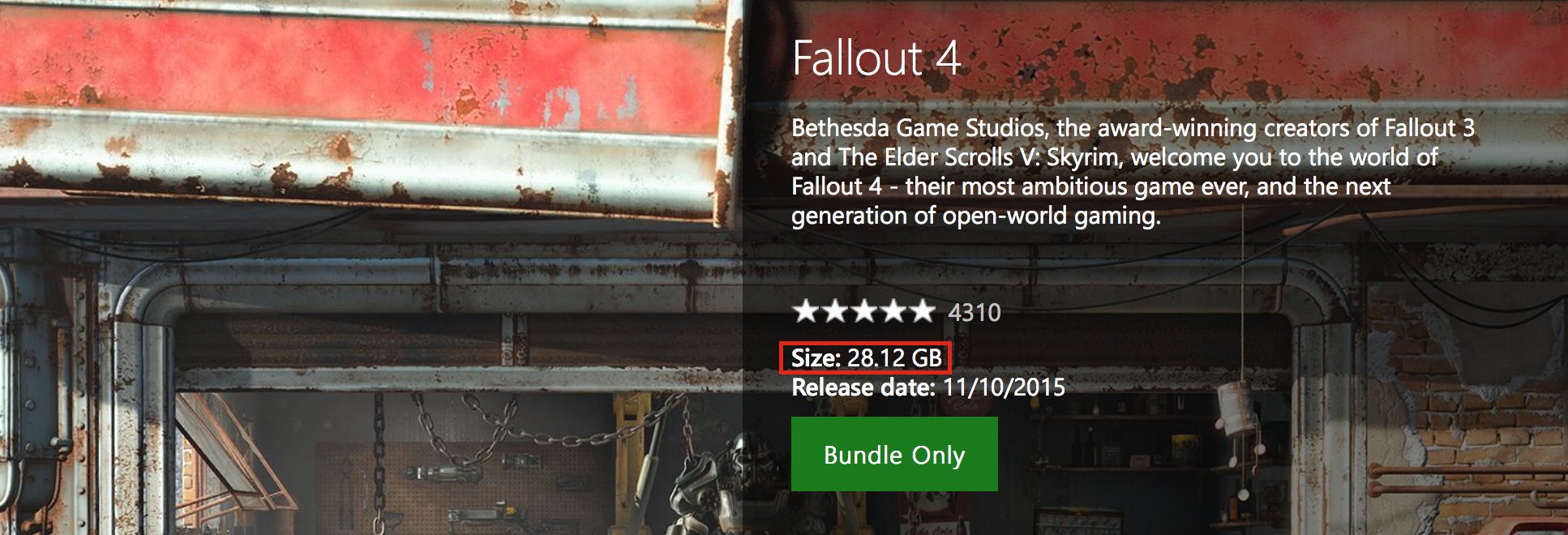 Sappiamo che Fallout 4 richiederà ben 400 ore per essere completato e, di conseguenza, sarà ben più vasto di Fallout 3 e del mastodontico Skyrim. Sappiamo anche che verrà sviluppato per la nuova generazione di console, quindi le texture avranno risoluzioni più elevate che in passato. Viene quindi da chiedersi quanto potrebbe pesare il download di un progetto tanto ambizioso. Oggi Microsoft ha rivelato le dimensioni del download per Xbox One e parliamo di ben 28.12 GB, cosa che obbligherà a una buona dose di pazienza, a meno di essere raggiunti dalla fibra ottica. Per fare qualche paragone, Fallout 3 pesa 5.48 GB mentre New Vegas si ferma a 4.78 GB, senza considerare le espansioni.