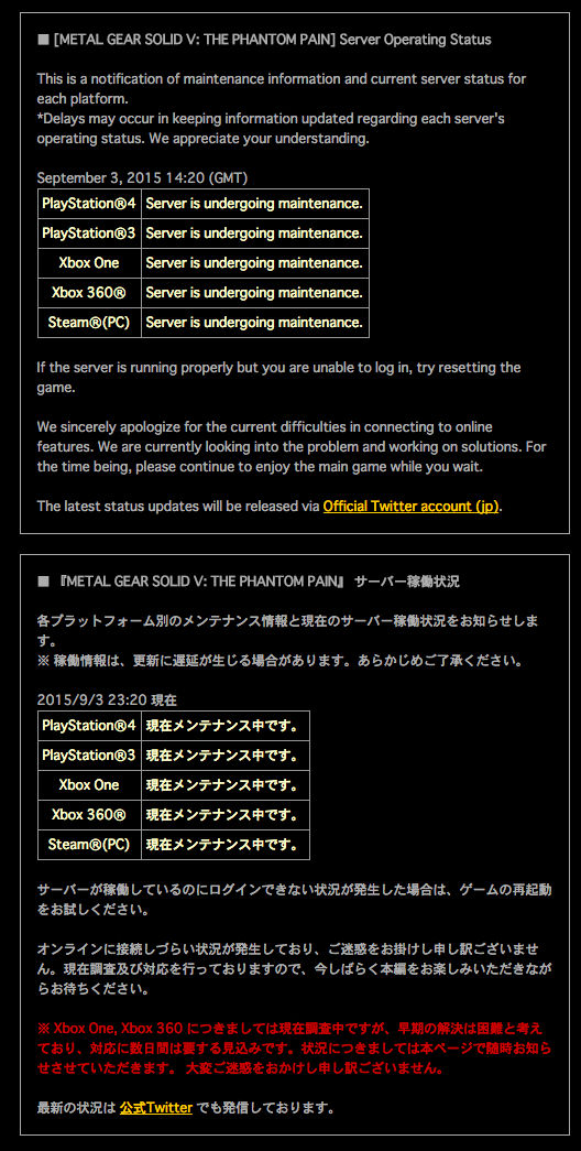 Secondo quanto tradotto da Game Informer, il testo in rosso (presente nell’immagine qui sotto, soltanto nella parte scritta in giapponese) specifica che Konami sta avendo problemi soprattutto con Xbox 360 e Xbox One. Tuttavia, dato che in Giappone le piattaforme Microsoft hanno un riscontro minore da parte del pubblico rispetto a quelle Sony, è plausibile che le priorità di Konami siano maggioremente focalizzate sulla fetta di mercato più consistente, quella cioè dei possessori di PlayStation.