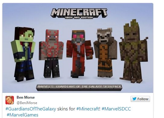 Ve l’avevamo annunciato già in precedenza: i Guardiani della Galassia faranno tappa anche su Minecraft. Le skin saranno disponibili per le versioni Xbox One e Xbox 360 tramite il “The Marvel’s Guardians of the Galaxy Skin Pack”. Attraverso Twitter, Ben Morse, editore presso Marvel, ha mostrato le suddette skin, senza però annunciare una data d’uscita del pacchetto.