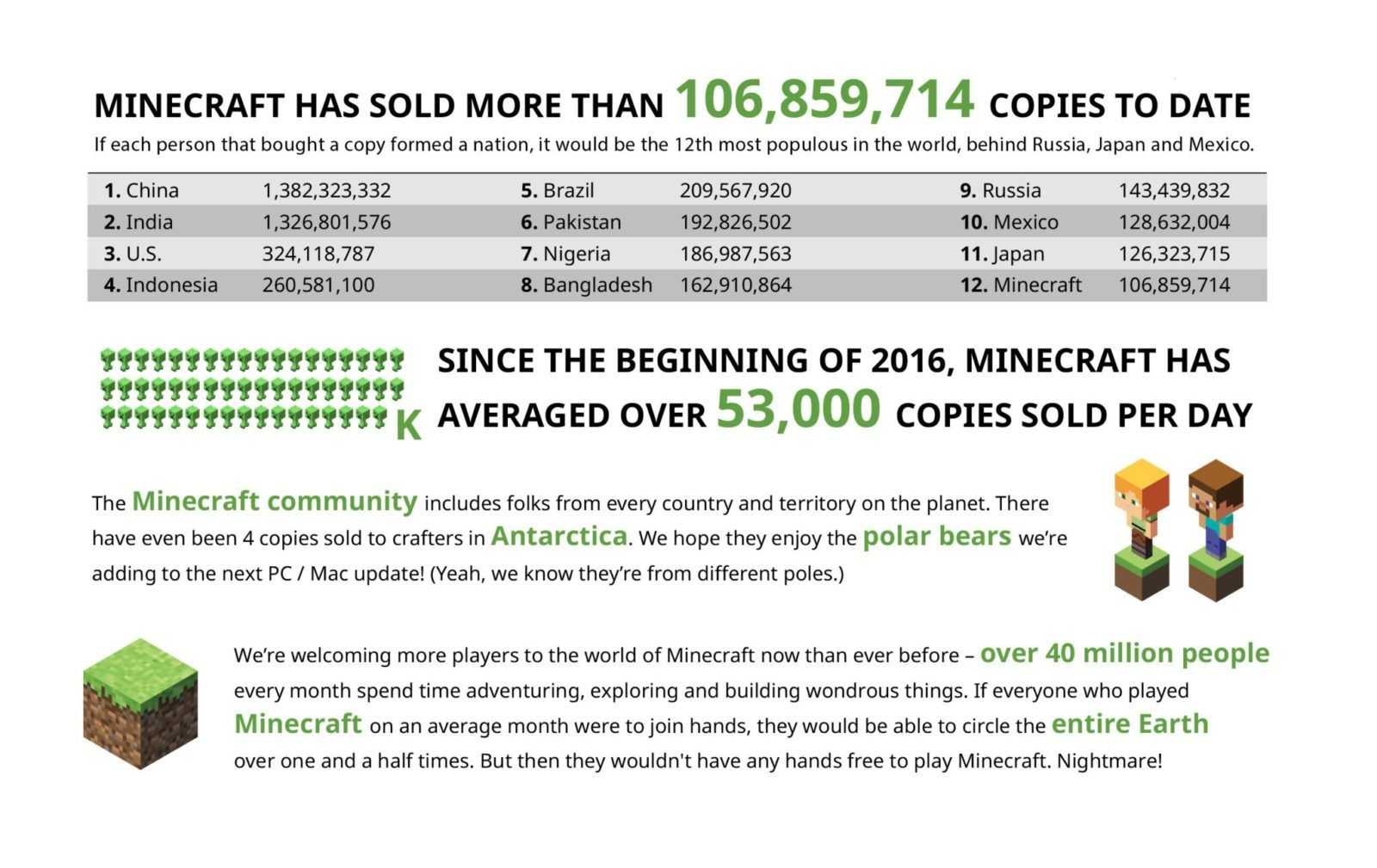 Grazie ai dati apprendiamo anche che la maggior parte degli utenti sembra preferire la versione mobile del gioco, al top delle classifiche di vendita, seguita da quella console e PC e che anche in Antartide ci sono dei giocatori di Minecraft… ben quattro!