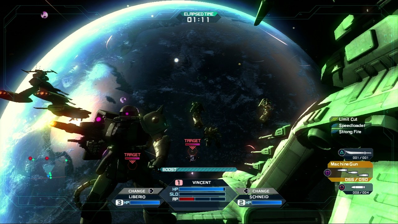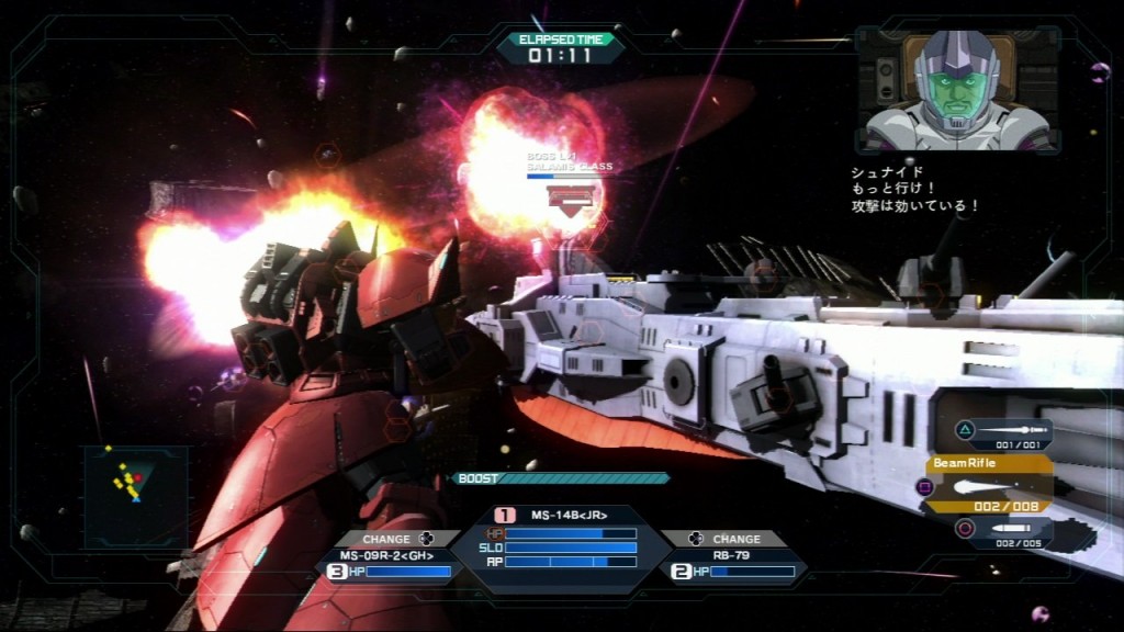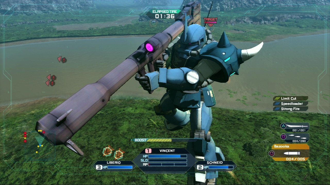 In Missing Link ci si trova infatti al comando di un plotone di tre mobile suit che potete controllare selezionandoli con la croce direzionale, sia perché obbligati dall’elevato danneggiamento del proprio mech, e sia per questioni tattiche. I membri del team, infatti, possiedono armamenti e prestazioni diverse, differenziandone i ruoli nel campo di battaglia; questo, sfortunatamente, è l’unico elemento strategico concesso al giocatore. A differenza di altri giochi ispirati a Gundam, non è possibile impartire ordini ai propri compagni ne personalizzare i robot: Missing Link non concede neppure di modificare le armi della propria unità all’inizio delle missioni, precedute da un semplice briefing. Poca anche la varietà degli obiettivi che si limitano alla distruzione di tutti gli avversari, il raggiungimento di un punto nella mappa, la protezione di alleati o l’eliminazione di un determinato bersaglio. Anche la loro durata è ridotta, non superando generalmente i sei minuti.