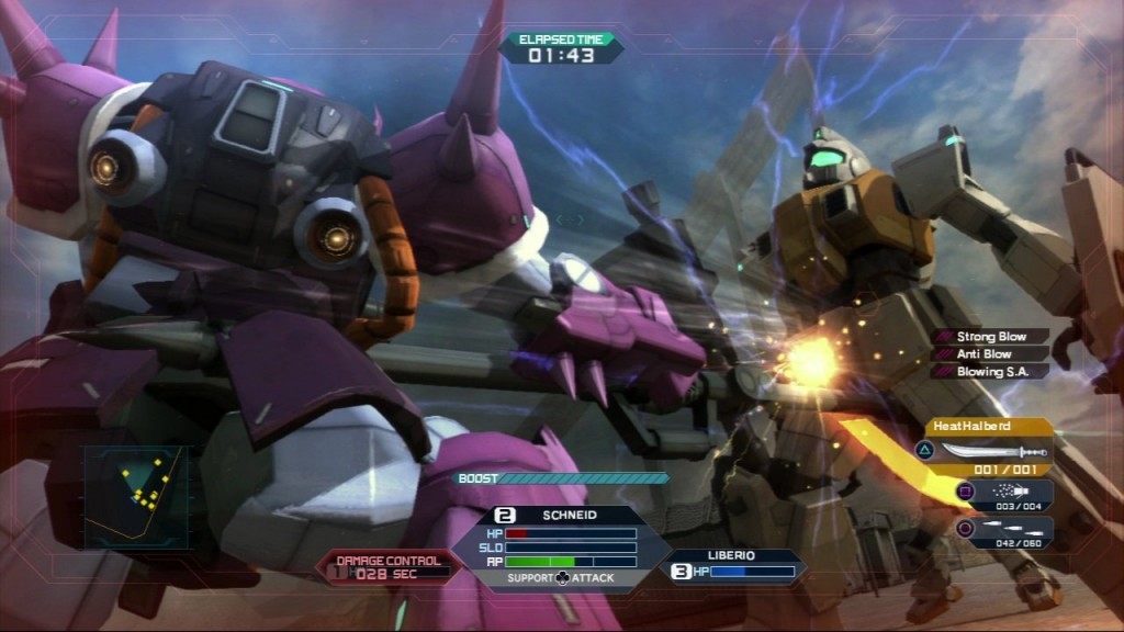 Ogni mech è dotato di tre attacchi normali, rappresentati da due armi a lungo raggio e una per il corpo a corpo. Utilizzando queste armi assieme alla pressione del tasto L2 è possibile eseguire tre attacchi speciali, il cui utilizzo consuma una barra sullo stile dei picchiaduro, ricaricabile combattendo. L’impiego di queste tecniche si rivela spesso essenziale per concludere le missioni, specie quando si combatte contro i boss. La stessa barra è usata per chiedere il supporto di veicoli o dei propri compagni di squadra.