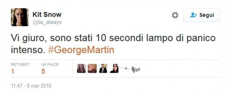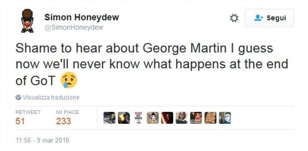 Il delirio virtuale generatosi per la confusione sulle due celebrità (George R. R. Martin sta bene, ve lo giuriamo!) ha particolarmente attecchito negli Stati Uniti, ma sembrerebbe che anche nella nostra italica penisola qualche fan troppo accanito abbia già dichiarato che non riuscirà mai a scoprire come Le Cronache del Ghiaccio e del Fuoco termineranno.