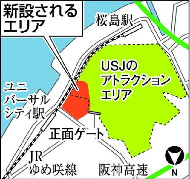 Sankei News riporta che sono stati spesi 40 miliardi di yen (351 milioni di dollari). Il quotidiano sottolinea che si tratta di un investimento su larga scala, simile a quello che Universal Studios ha fatto per realizzare l’area dedicata al magico mondo di Harry Potter. Nell’immagine che potete vedere qui sotto, in rosso è segnata l’area dedicata a Nintendo, mentre il verde è la zona riservata agli attuali attrazioni di Universal Studios Japan.