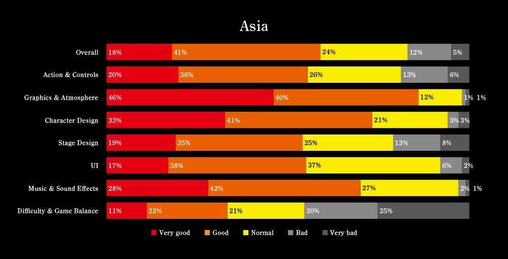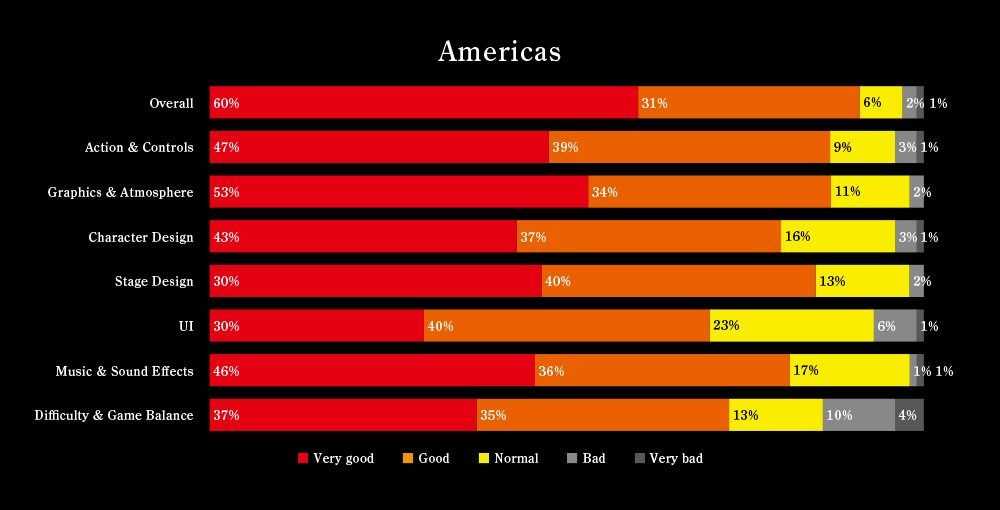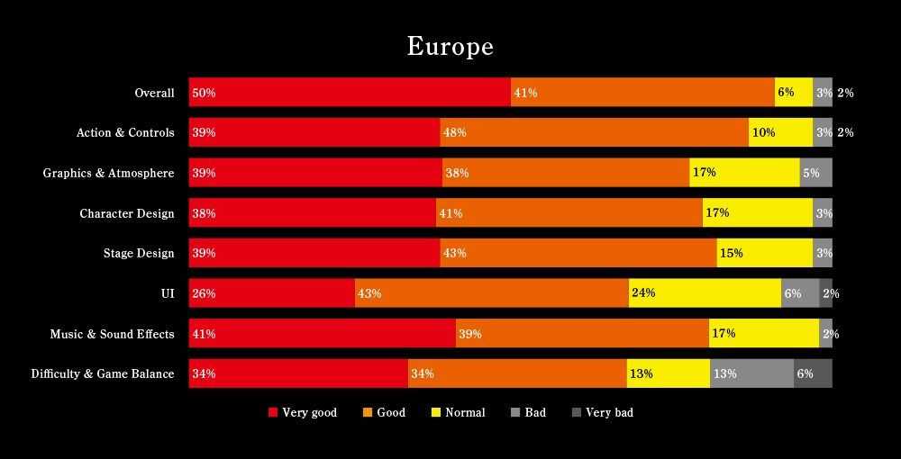 Secondo i dati presentati, ben il 91% degli utenti europei avrebbe trovato il gioco decisamente soddisfacente (il 50% lo ha trovato molto positivo e il 41% positivo), percentuali più basse sarebbero invece state evidenziate dai dati raccolti dagli utenti asiatici e americani.