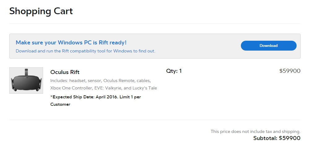 Oculus Rift arriverà ad aprile. Le prime spedizioni avverranno a fine marzo, esattamente il 28, in questi 20 paesi: Australia, Belgio, Canada, Danimarca, Finlandia, Francia, Germania, Giappone, Islanda, Irlanda, Italia, Olanda, Nuova Zelanda, Norvegia, Polonia, Spagna, Svezia, Taiwan, Regno Unito e USA. E si parla anche di una disponibilità “retail” presso rivenditori non ancora annunciati. Ma ipotizzo solo negli States. Chi dovesse decidere, come il sottoscritto, di procedere con il preordine si vedrà addebitato l’importo solo all’atto dell’effettiva spedizione del prodotto. Oculus Shop deve aver ricevuto parecchi accessi, viste le difficoltà ad aprire la pagina e a completare il preordine. Tra l’altro lo store – omettendo una virgola – indica erroneamente 59900 $ o 69900 € nella schermata di checkout! La voce “Estimated Total” fortunatamente riporta le cose alla loro giusta dimensione.