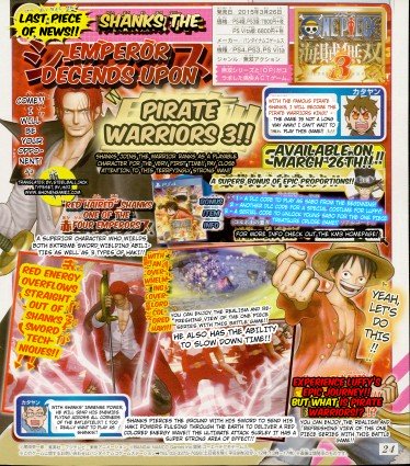 Shanks il rosso sarà uno dei personaggi giocabili in One Piece: Pirate Warriors 3. La conferma è arrivata dall’ultima scan tratta dalla rivista giapponese Weekly Shonen Jump, che ha rivelato la possibilità di utilizzare il potentissimo “Imperatore” pirata. Shanks è uno dei personaggi più potenti dell’intero manga/anime e la sua ambizione (Haki in lingua originale) potrà essere utilizzata anche all’interno del gioco.