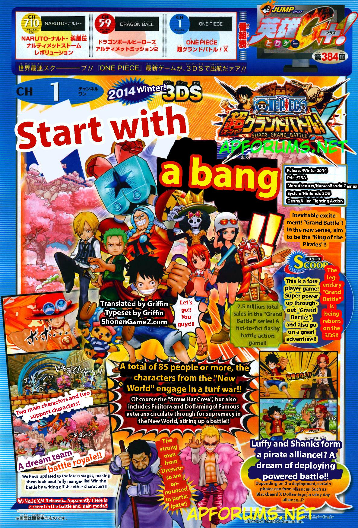 L’ultimo numero del settimanale giapponese Jump ha pubblicato la notizia che One Piece: Super Grand Battle X ospiterà ben 85 personaggi, anche se non è chiaro al momento quanti e quali siano giocabili. Questo gioco è stato aggiornato in modo da rappresentare una fase di congiunzione con la storia del manga, anche se ulteriori dettagli verranno diffusi nelle prossime settimane.
