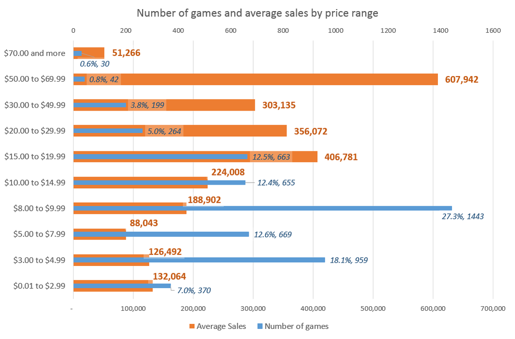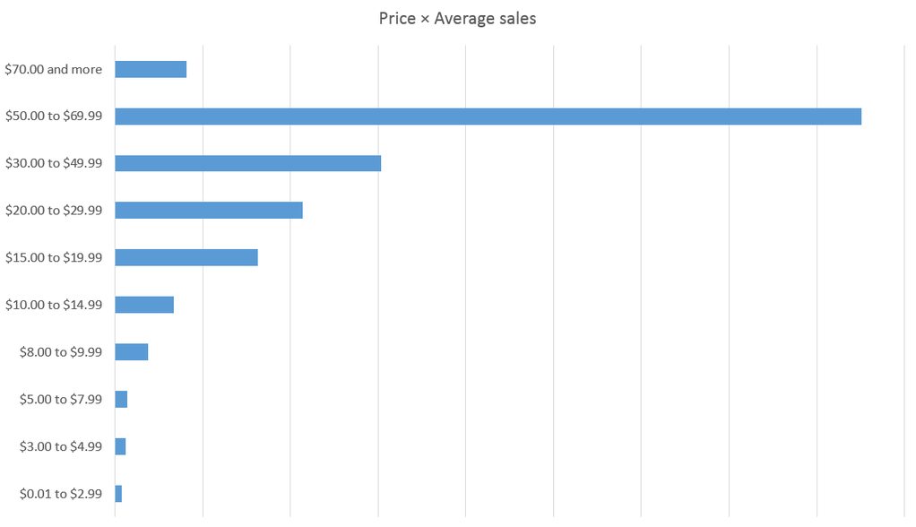 Sorprendentemente, non sono i più economici a vendere di più, accade piuttosto il contrario: come potete vedere nel grafico sottostante, i titoli compresi tra i 50 e i 70 dollari vendono in media 607.942 copie, pur trattandosi di un misero 0.8% dell’intero catalogo Steam.