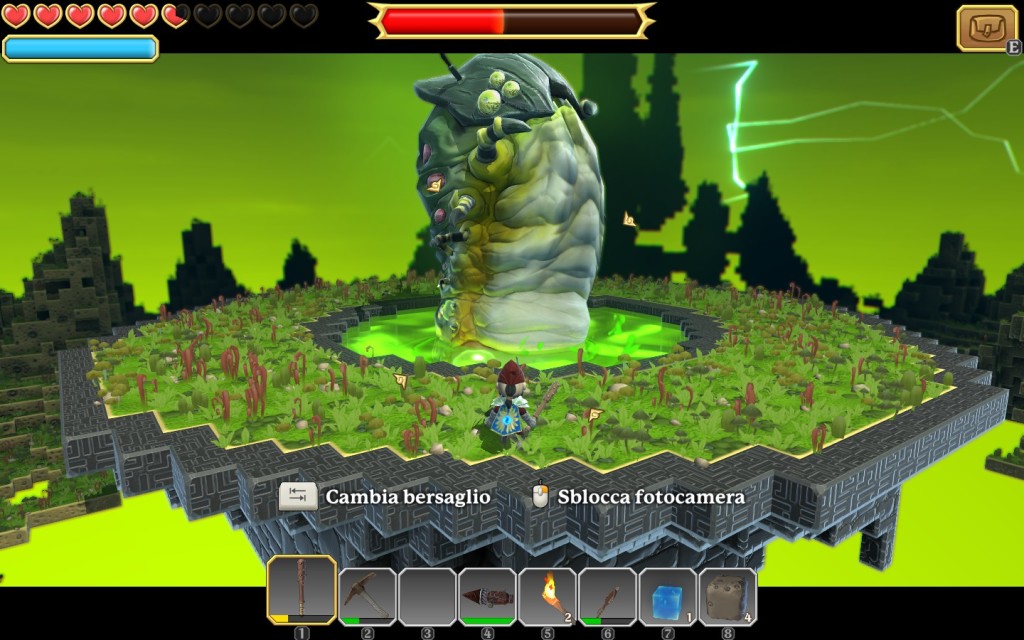 In tal proposito, vi è da accennare che anche il combattimento stesso non è decisamente tra i più raffinati e complessi, ma riesce a incastrare perfettamente semplicità e azione quanto basta per rendere Portal Knights un gioco relativamente ostico e appagante. Schivate, salti e capriole saranno il nostro pane quotidiano in ognuno dei combattimenti che ci ritroveremo ad affrontare in ciascuno dei tanti mondi che visiteremo nel nostro peregrinare. Nemici in grado di scatenare la furia degli elementi, grossi e forzuti orchi, scimpanzé infuriati o bulbi oculari incrociati con pipistrelli famelici saranno i nostri acerrimi compagni di viaggio, sempre presenti e pronti a fornirci i punti esperienza necessari per avanzare di livello, ottenere nuove abilità e proseguire verso il nostro obiettivo ultimo: terminare il gioco e raggiungere l’ultima isola, rinsaldare “la frattura” che ha distrutto il nostro universo in una miriade di separate isole e diventare degli eroi. Tipico.