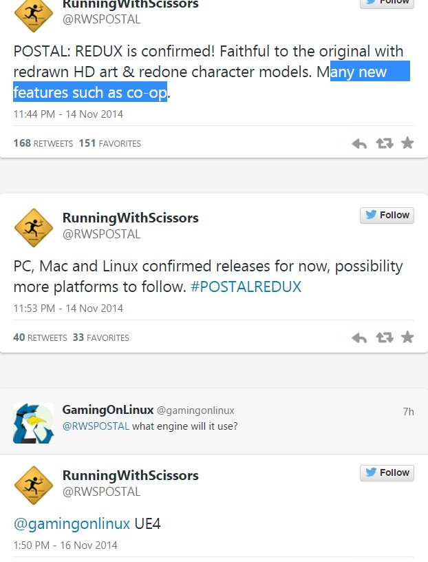 Il nuovo Postal sarà inoltre caratterizzato da una modalità in cooperativa e arriverà al momento soltanto su PC e Mac nel 2015. Non è esclusa la possibilità di vedere il gioco anche su console, ma al momento la realizzazione su PC rimane una priorità.
