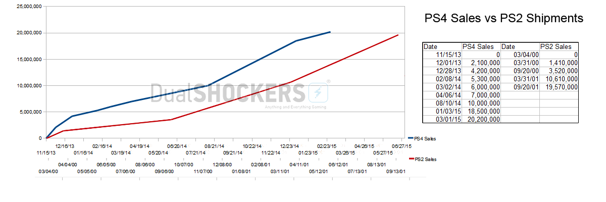 Viene dunque da chiedersi quanta differenza ci sia tra la nuova piattaforma e la sua “venerabile nonnina”. La risposta ci viene data da un grafico di DualShockers, che mette in relazione i risultati delle due console. Va considerato il fatto che il lancio di PlayStation 2 era più “disteso nel tempo” rispetto a quello della novella piattaforma, con il debutto in Nord America e in Europa a sette mesi di distanza da quello giapponese. Al contrario, PlayStation 4 è uscita in Giappone quattro mesi dopo l’esordio in occidente.