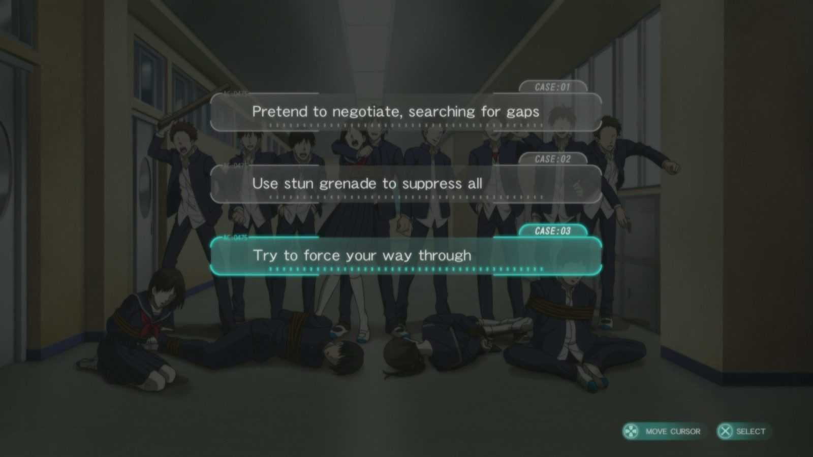 Comunque, le scelte sono importanti per il modo in cui influiscono sullo Psycho-Pass del personaggio selezionato. Le azioni non cambiano il susseguirsi delle vicende. Ciò che le scelte cambiano è il punto della storia in cui si piazza il personaggio, e quindi ciò che è in grado di scoprire del mistero dietro Alpha. Nel caso di Nadeshiko, per esempio, se la situazione precipita il suo Psycho-Pass può superare il confine del 100%, facendo di lei una criminale latente e limitando la sua libertà. Un altro percorso non la fa andare oltre il 100%, rendendola un Ispettore ligio al dovere e rispettoso delle regole. Tuttavia il percorso più interessante è quello che la tiene in bilico, mentalmente instabile da riottenere parte dei suoi ricordi ma non così tanto da diventare una criminale. Questa strada non solo mostra tutte le sfaccettature della trama, ma risponde anche una delle domande interessanti.