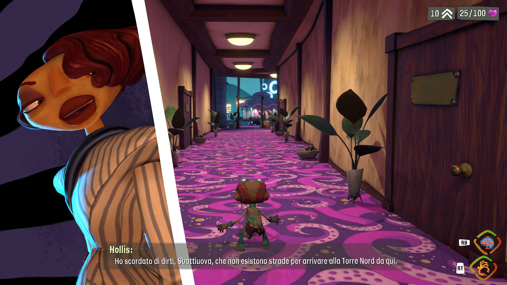Prima di analizzare nel dettaglio il gameplay, partiamo da un presupposto che potrebbe sembrare una critica, ma in realtà non lo è affatto. Psychonauts 2 non ha una meccanica next-gen, alla stregua dei portali di Ratchet and Clank: Rift Apart (seppur questa sia stata usata in modo limitato da Insomniac, quasi a mo’ di esercizio di stile, una sorta di bozza per il futuro della serie), perché, in primo luogo, il livello delle due produzioni è molto diverso, in secondo luogo, perché non ne ha bisogno.