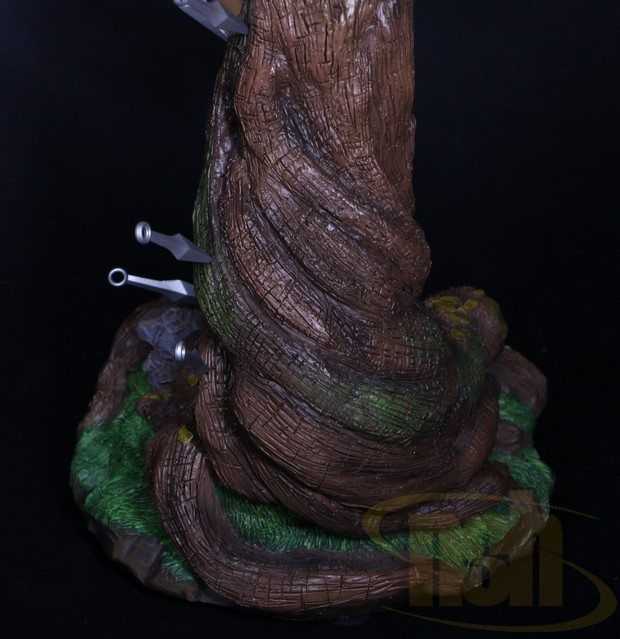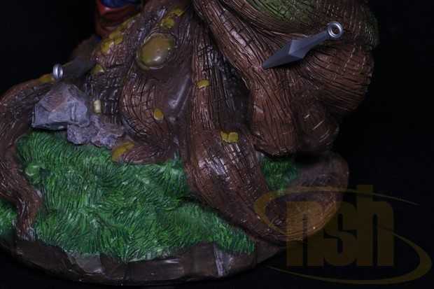 Il viso è scolpito in modo perfetto come la colorazione, perfetta in ogni sua parte. Altro punto di forza di questa statua è sicuramente il diorama usato come base, composto da un tronco spezzato con la relativa vegetazione tra le radici e le rocce. Cinque kunai in metallo sono stati conficcati nella corteccia per enfatizzare ancora di più la dinamicità della scena di combattimento.