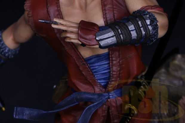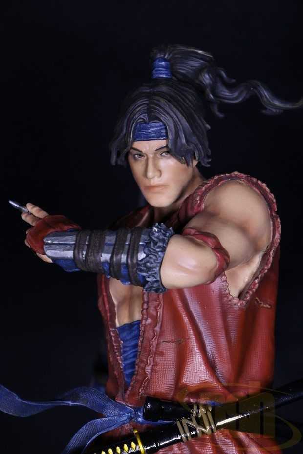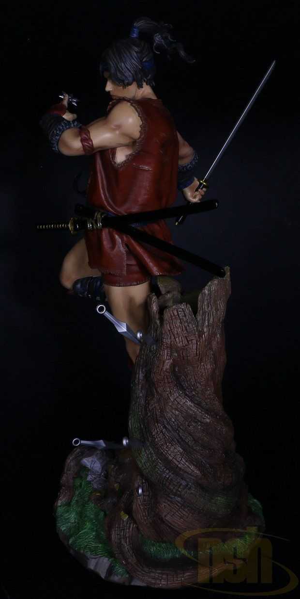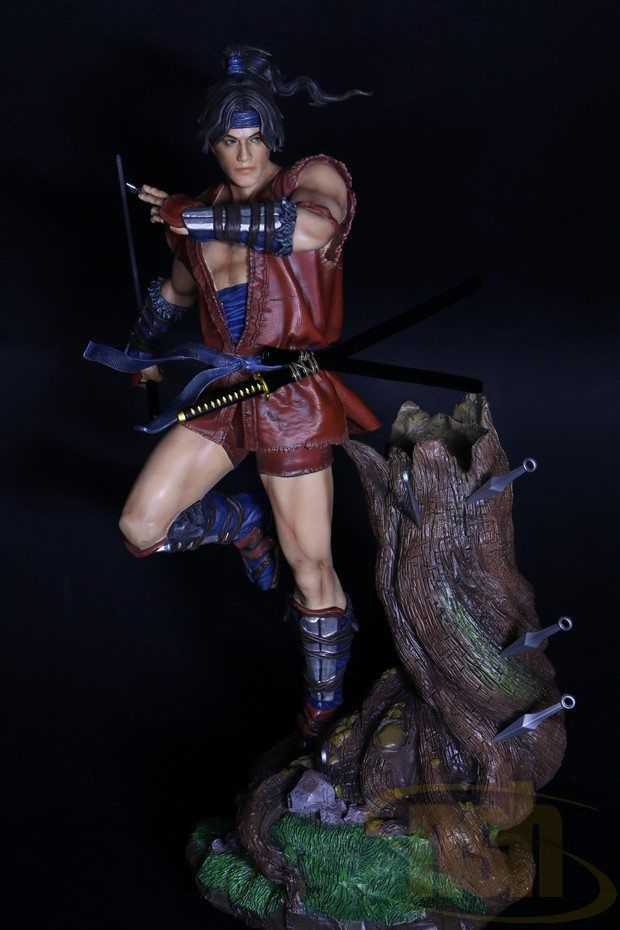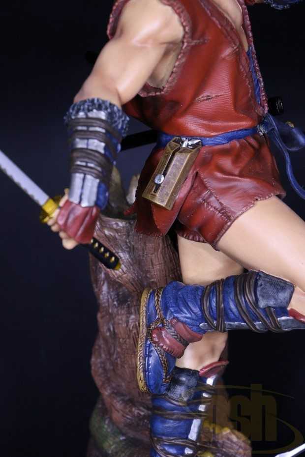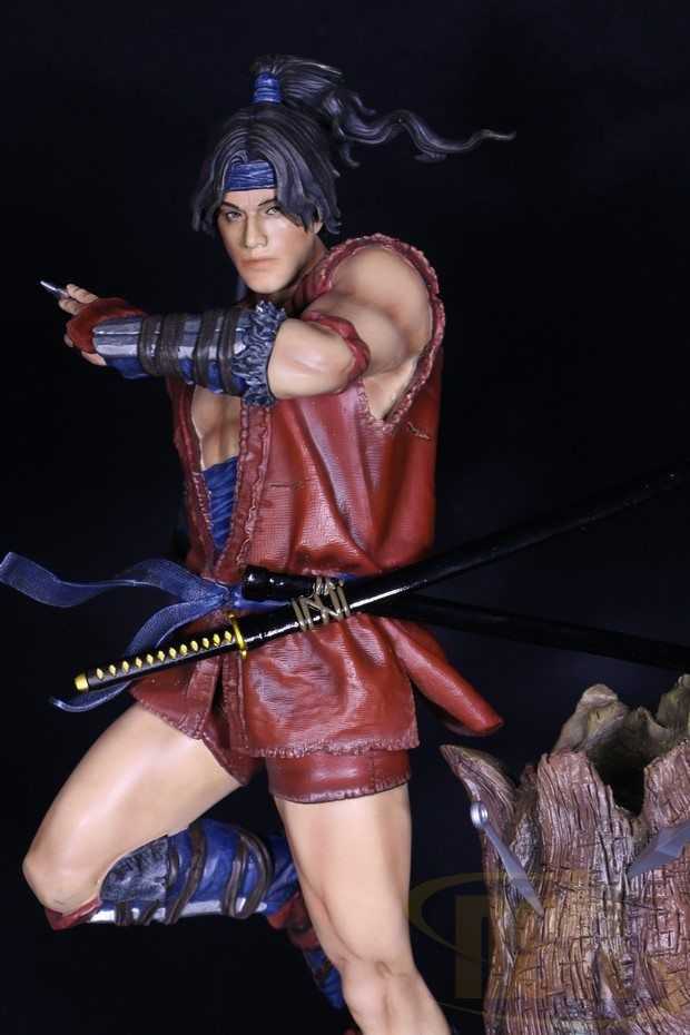 La posa molto è bella, con Kage pronto a lanciare uno shuriken con la mano sinistra mentre impugna una kodachi con la destra. Kage poggia solo sul piede sinistro, mentre il piede destro è sollevato, permettendo di ammirare anche i dettagli delle calzature. Sul fianco destro vediamo i foderi delle spade.