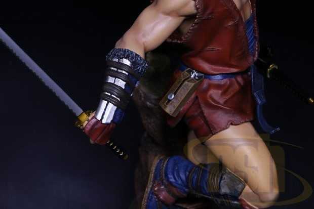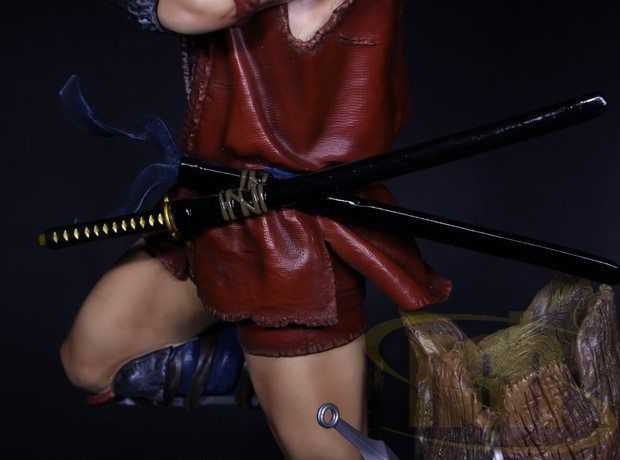 La confezione, adornata con un elegante raso nero, mostra la statua divisa nei vari componenti da assemblare. Quest’ultima operazione non presenta grandi difficoltà, grazie anche alle istruzioni presenti nella confezione. Al suo interno troviamo: la base, la statua, le due braccia, i pugnali in metallo, il fodero delle spade, la ciocca di capelli e lo shuriken (sempre in metallo).