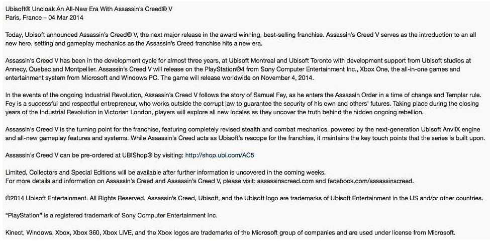 Un utente di Reddit, Shadesta9, sostiene di aver messo le mani su un comunicato stampa di Ubisoft, che secondo lui dovrebbe essere divulgato il 4 marzo 2014 e nel quale verrà annunciato il nuovo capitolo della saga di Assassin’s Creed. Il titolo sarà Assassin’s Creed V e il gioco sarà ambientato durante gli ultimi anni della rivoluzione industriale, nella Londra Vittoriana. Assassin’s Creed V secondo il comunicato (che trovate di seguito sotto forma di immagine) introdurrà un nuovo eroe, una nuova ambientazione e nuove meccaniche di gameplay. L’eroe si chiamerà Samuel Fey ed entrerà nell’ordine degli Assassini in un periodo di grandi cambiamenti e di forte dominio da parte dei Templari. Fey è un imprenditore molto rispettato, che lavora onestamente per garantire un futuro alla propria famiglia. I giocatore nei suoi panni potranno esplorare la città e mettere a nudo la verità che si cela dietro ad una misteriorsa rivolta. Si trattera di un punto di svolta nel franchise, con meccaniche stealth e di combattimento completamente riprogettate e un nuovo engine grafico AnvilX. Ci saranno grandi novità a livello di gameplay, mantenendo però le basi che hanno reso celebre la serie. Il titolo sarebbe in sviluppo da circa 3 anni presso gli studi di Ubisoft Montreal e Ubisoft Toronto, con il supporto degli studi di Annecy, Quebec e Montpellier. E dovrebbe uscire su PS4, Xbox One e PC il prossimo 4 novembre. Quindi niente console “current gen” e niente WiiU. Sarebbero previste anche edizioni Limited, Special e Collector di Assassin’s Creed 5, che verrranno annunciate successivamente. Ricordate che si tratta solo di un rumor!! Quindi non resta che attendere eventuali comunicazioni da parte di Ubisoft. In fondo il 4 marzo non è lontano…