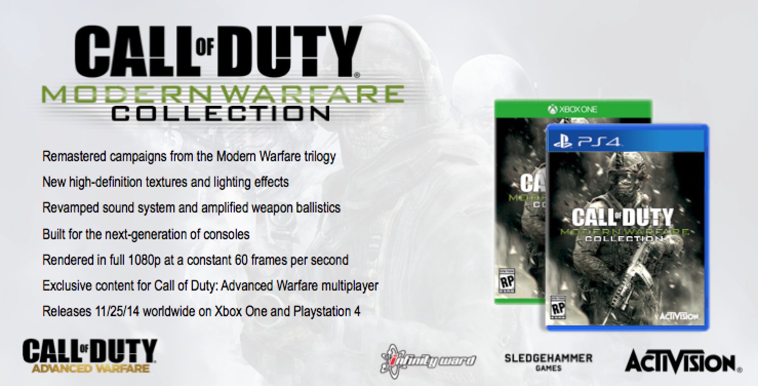 Su Reddit è apparsa una strana immagine che mostra una Collection di Call of Duty: Modern Warfare per PlayStation 4 e Xbox One. L’immagine è molto dubbia, dato che richiamerebbe a una rimasterizzazione di tutti i capitoli di Modern Warfare sulle due console next-gen. Activision non ha annunciato nulla (almeno per il momento) e quindi consideriamo tutto questo solo come un semplice rumor.