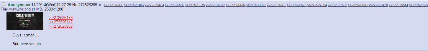 Da tempo si vocifera della possibilità che la saga di Call of Duty ritorni alla Seconda Guerra Mondiale con un secondo capitolo di World at War ad opera di Treyarch. L’indizio più concreto in questo senso è apparso sul forum 4Chan lo scorso novembre, quando un sedicente ex-impiegato di Treyarch ha pubblicato una serie di immagini che “l’azienda non vuole siano ancora mostrate al pubblico”.